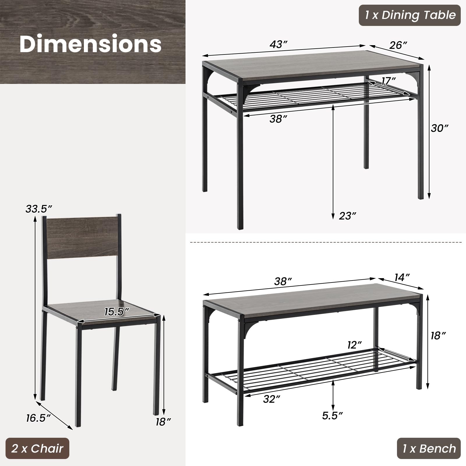 - 【Space-Saving Design】This 4 pcs dining table set features two armless chairs and a bench that can be tucked under the table, without taking up too much space. Ideal for apartments or smaller rooms where space is a premium, yet versatile enough to accommodate small get-togethers for chatting and eating together.