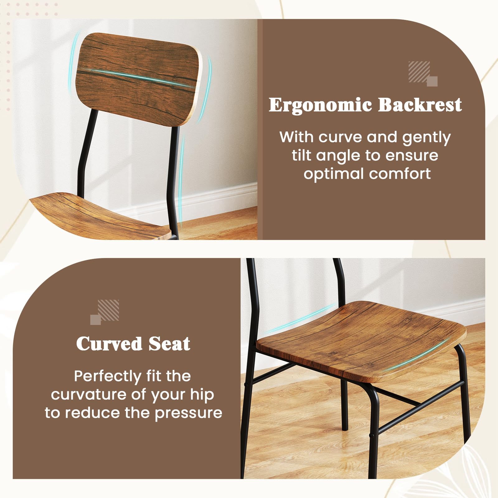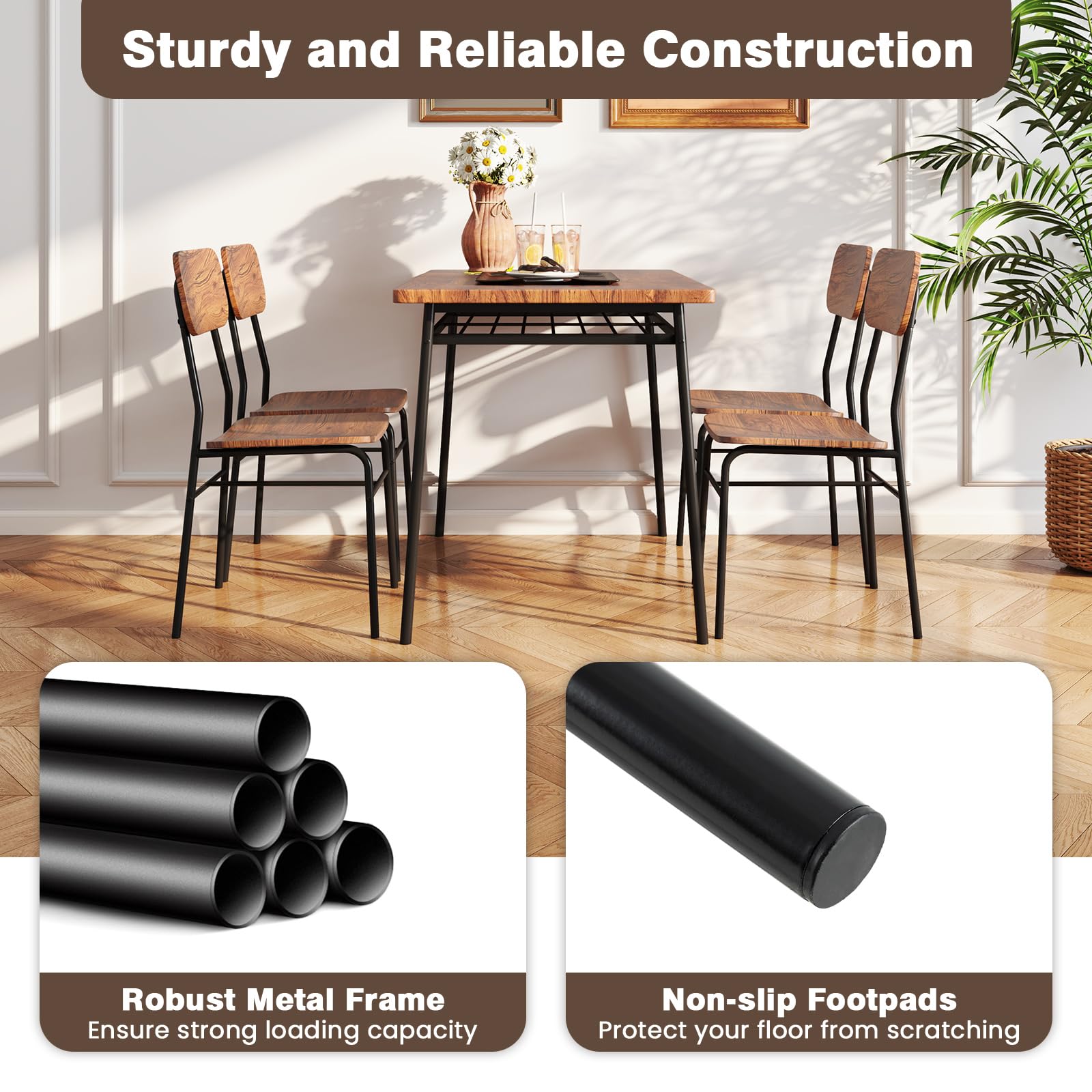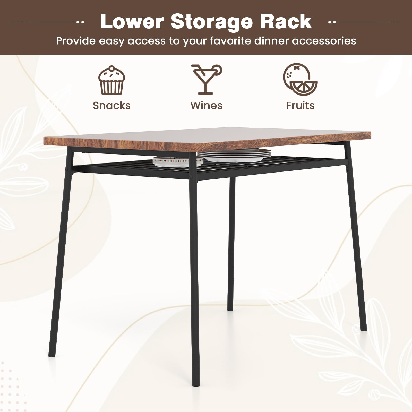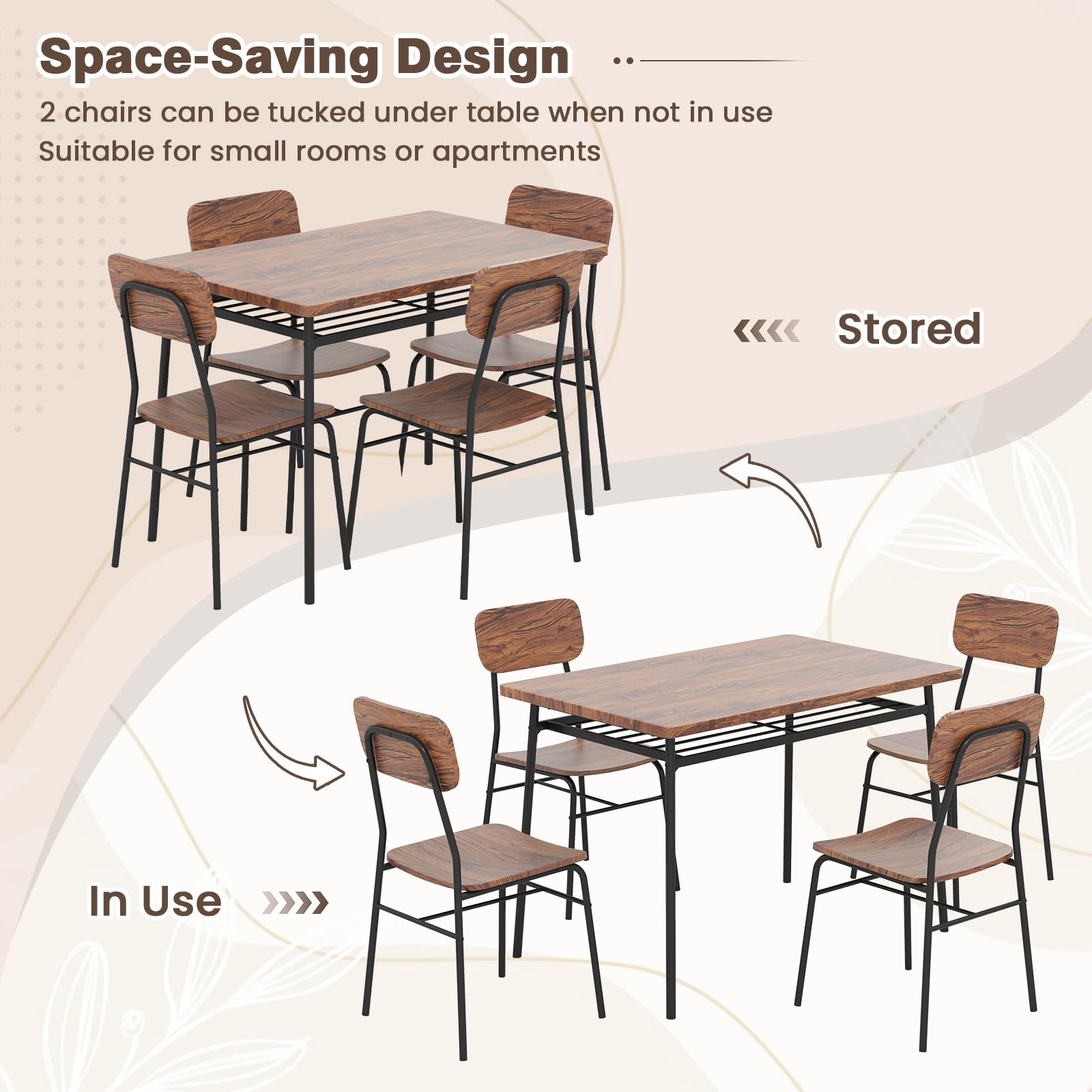 This dining table set is designed with a convenient built-in storage rack underneath the table, allowing you to keep dining essentials like snacks, wines, or magazines neatly organized and within easy reach. After meals, the 4 chairs can be tucked neatly under the table, maximizing space and ensuring a clutter-free environment. Crafted with a sturdy metal frame, the table and chairs offer unmatched strength and stability. The waterproof veneered MDF tabletop makes maintenance effortless, while the faux wood finish paired with metal accents adds a touch of retro elegance to your living space. Whether your style is modern, rustic, or eclectic, this versatile set complements various decorating themes seamlessly.