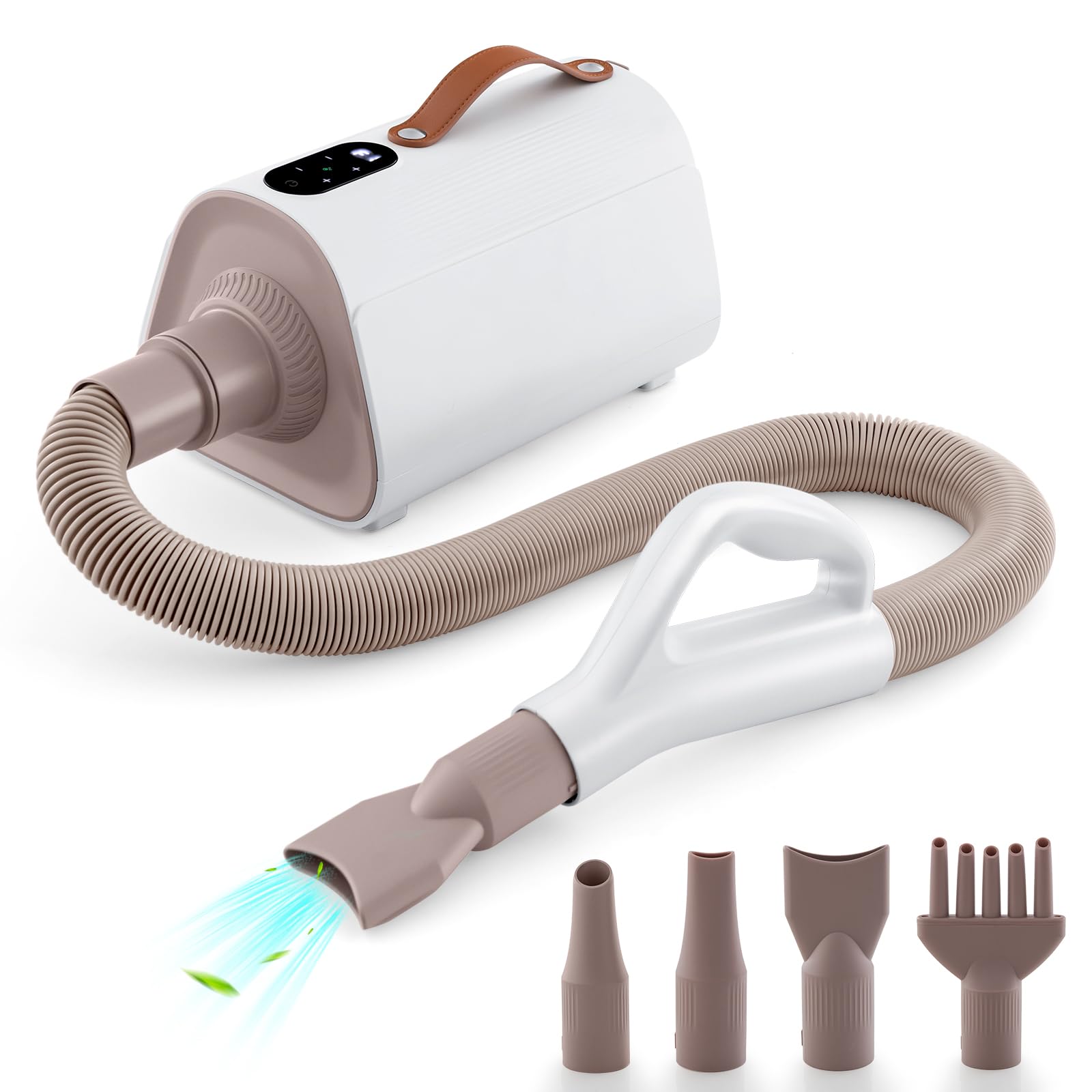 Our high-velocity dog hair dryer is designed to make pet drying and grooming a breeze. It is equipped with a 2.5 HP/1700 W powerful motor, ensuring efficient drying with a wind speed range of 30-95 m/s. Besides, it adopts a temperature range of 97-140 °F, guaranteeing the optimal drying environment for your furry friends. And with its intelligent LED touch screen, you can easily control the temperature and adjust the airflow with 5 speed settings. Besides, the negative ion function could reduce static and frizz, promoting healthy skin and coat. More than that, with 4 different nozzles included, this dryer is versatile and can be used for various purposes. The wide nozzle provides a gentle and even airflow, while the narrow nozzles concentrate the airflow for targeted drying. The comb nozzle is perfect for grooming and tangling. Experience the professional-grade performance and thoughtful design of our pet hair dryer. Provide your pets with a safe, efficient, and comfortable drying experience.