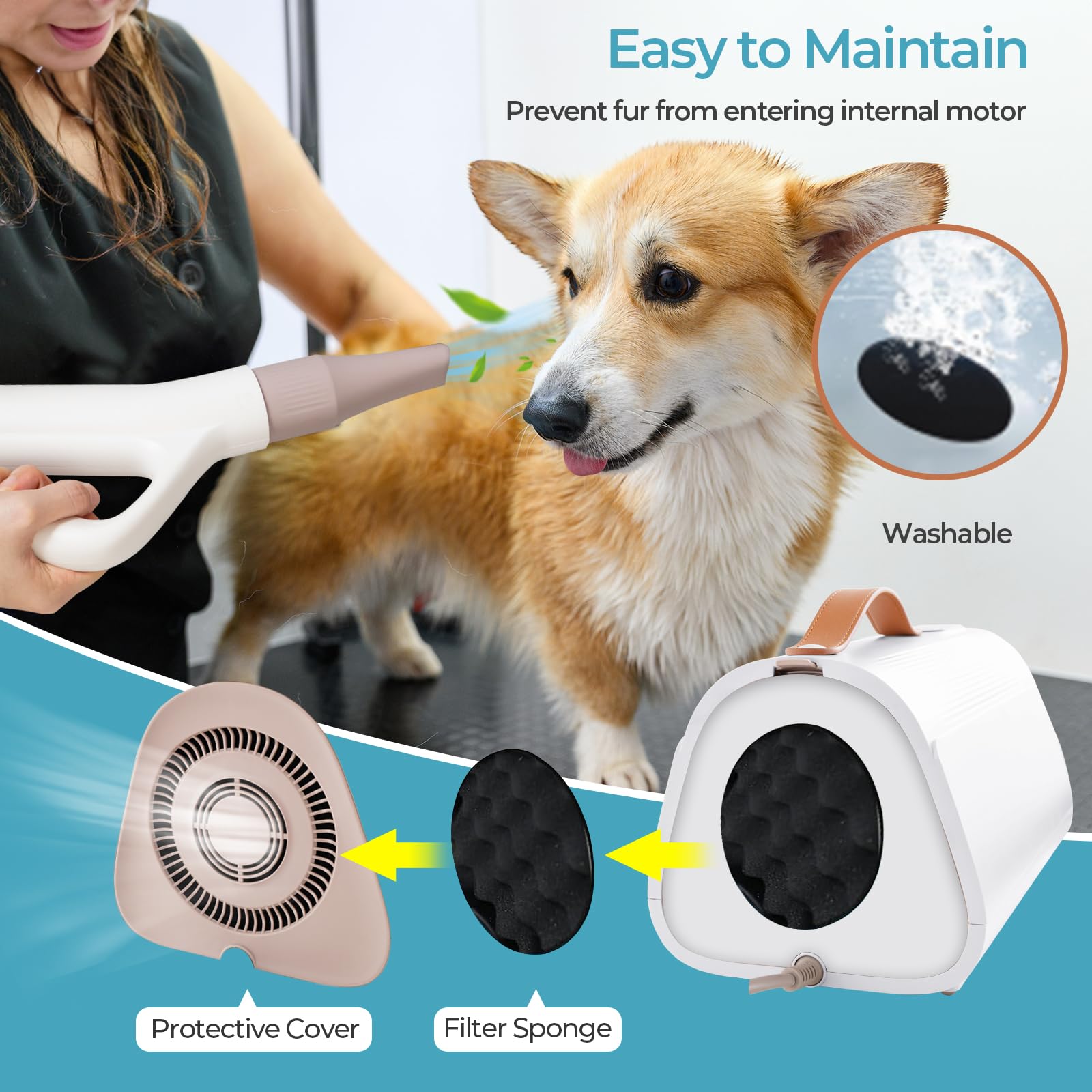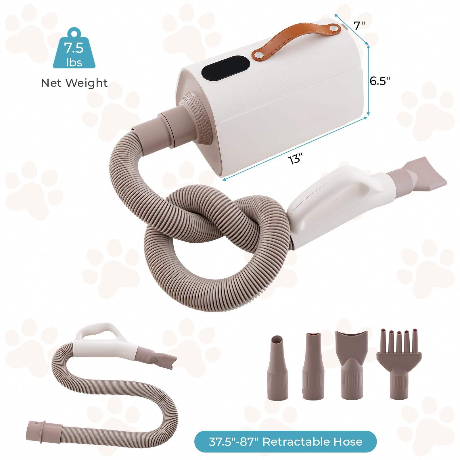 - User-Friendly Features: The dog blow dryer is designed with a protective cover and a filter sponge, which could prevent fur from entering the internal motor, and the sponge is washable, which is easy to maintain. Other than that, it comes with a 37.5”-87” retractable hose, offering flexibility during use. And the thick hose and insulated handle could keep you and your pet safe.