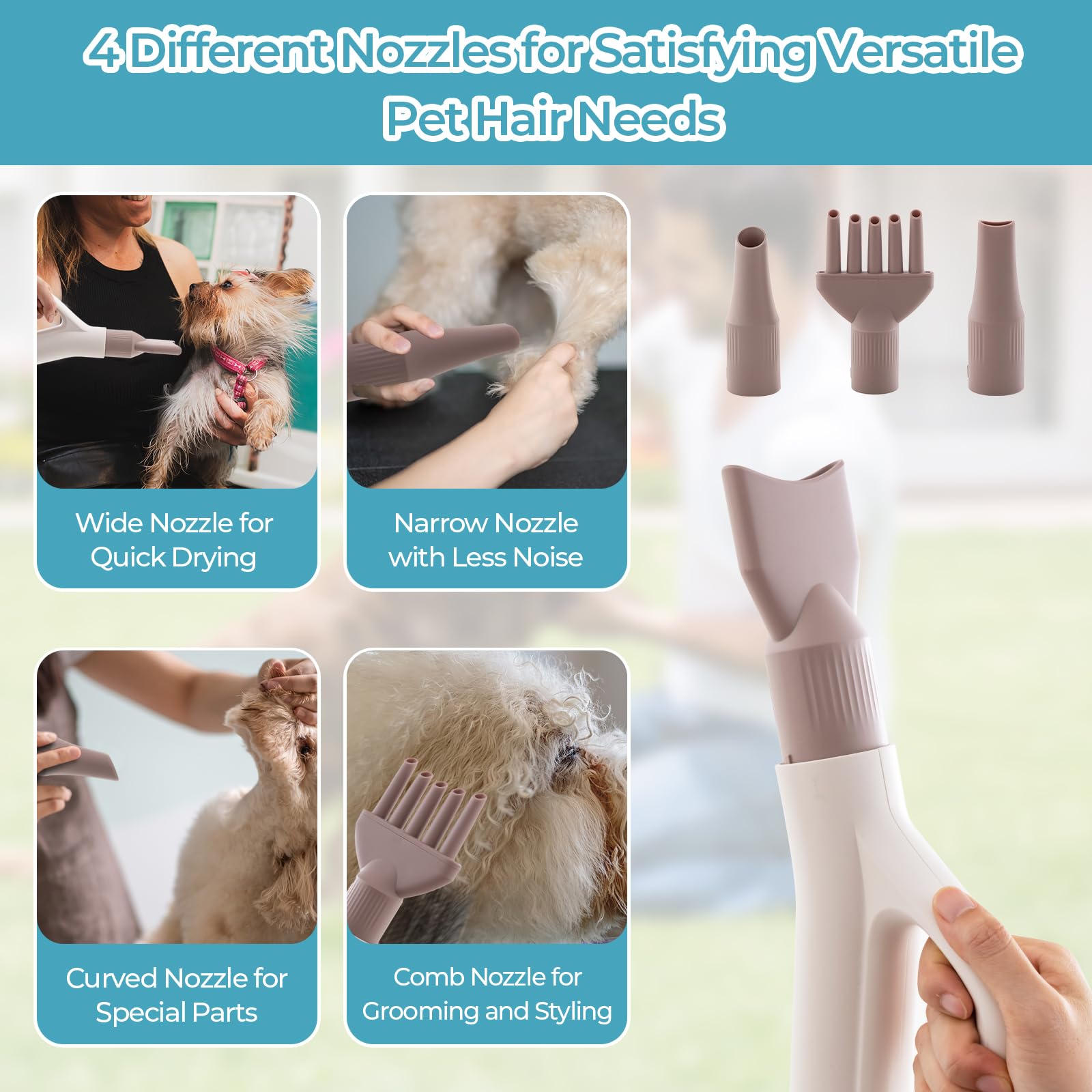 - 4 Multifunctional Nozzles: The dog hair dryer comes with 4 different nozzles for satisfying versatile pet hair needs. Use the wide nozzle for quick drying, the narrow nozzle for less noise, the curved nozzle for special parts, and the combo nozzle for grooming and styling.