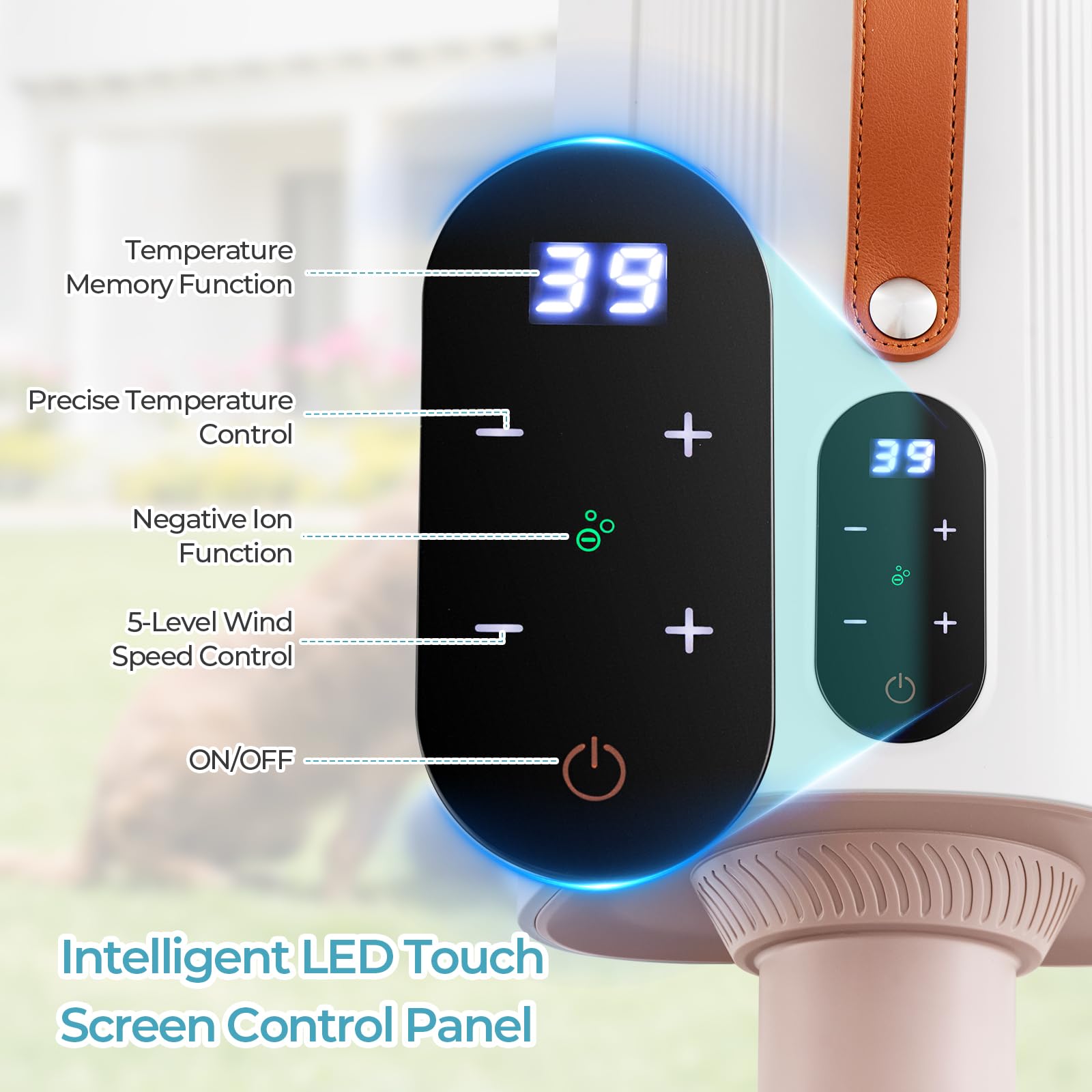 - Intelligent LED Touch Screen Control Panel: With a smart LED touch screen, this pet blow dryer allows you to easily adjust the temperature from 97 °F to 140 °F, and choose from 5-speed settings from 30 m/s to 90 m/s for precise control. And it features a temperature memory function to record your usage habits, making it more convenient to operate.