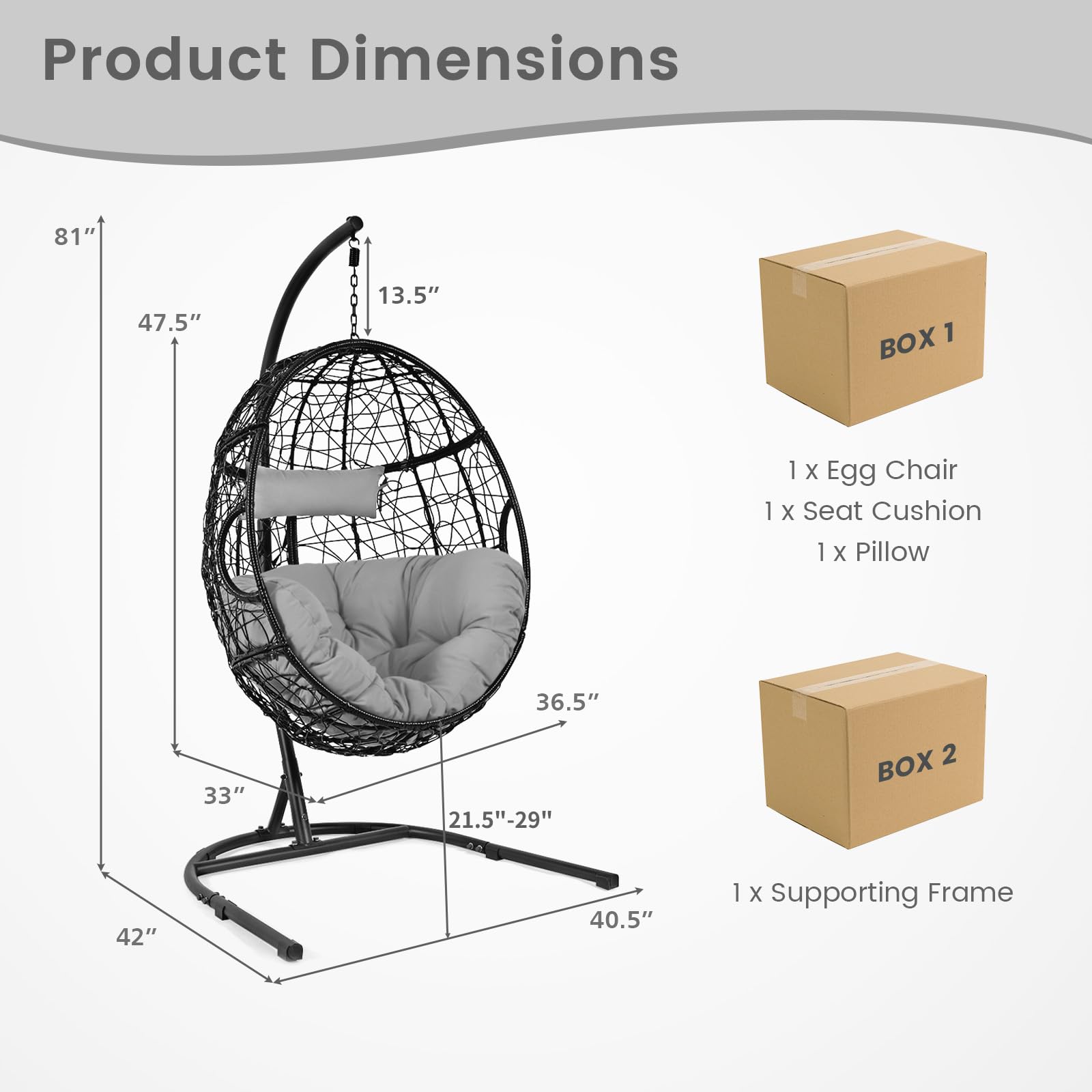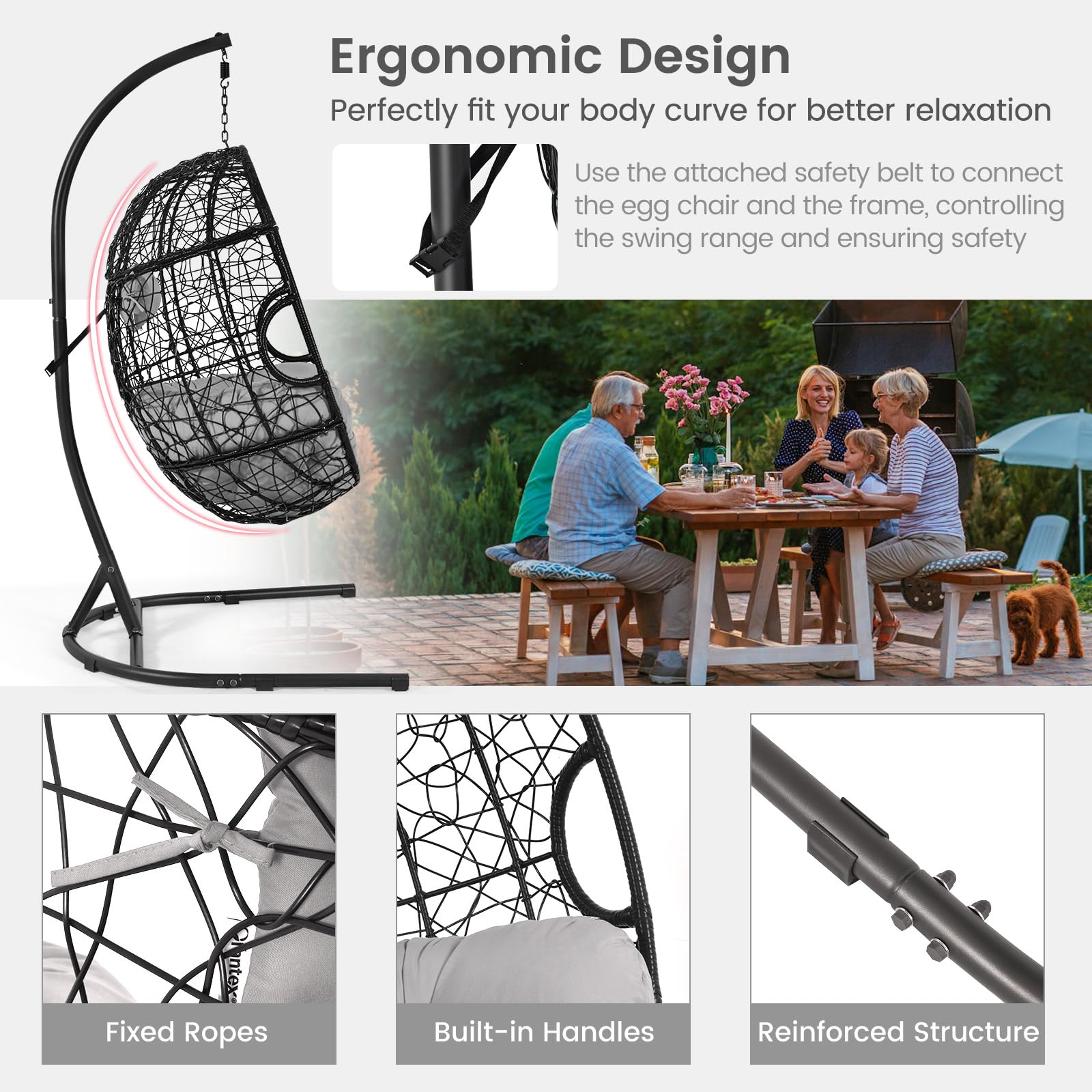 Our egg chair with stand measures 40.5” x 42” x 81” (L x W x H), which can be a perfect choice for enjoying leisure time, such as reading books, listening to music, enjoying beautiful sunsets, listening to the sound of nature, and more. We also provide a seat cushion and a soft pillow, making you fully relaxed when sitting in the deep egg chair. Besides, it is constructed of a heavy-duty powder-coated metal frame and the egg chair is wrapped by weather-resistant PE rattan, ensuring good sturdiness and long-lasting durability. And with an attached safety belt, the chair would gently rock in a swing range, ensuring safety. This exquisite and elegant egg swing chair can also be a perfect addition to your indoor and outdoor areas.