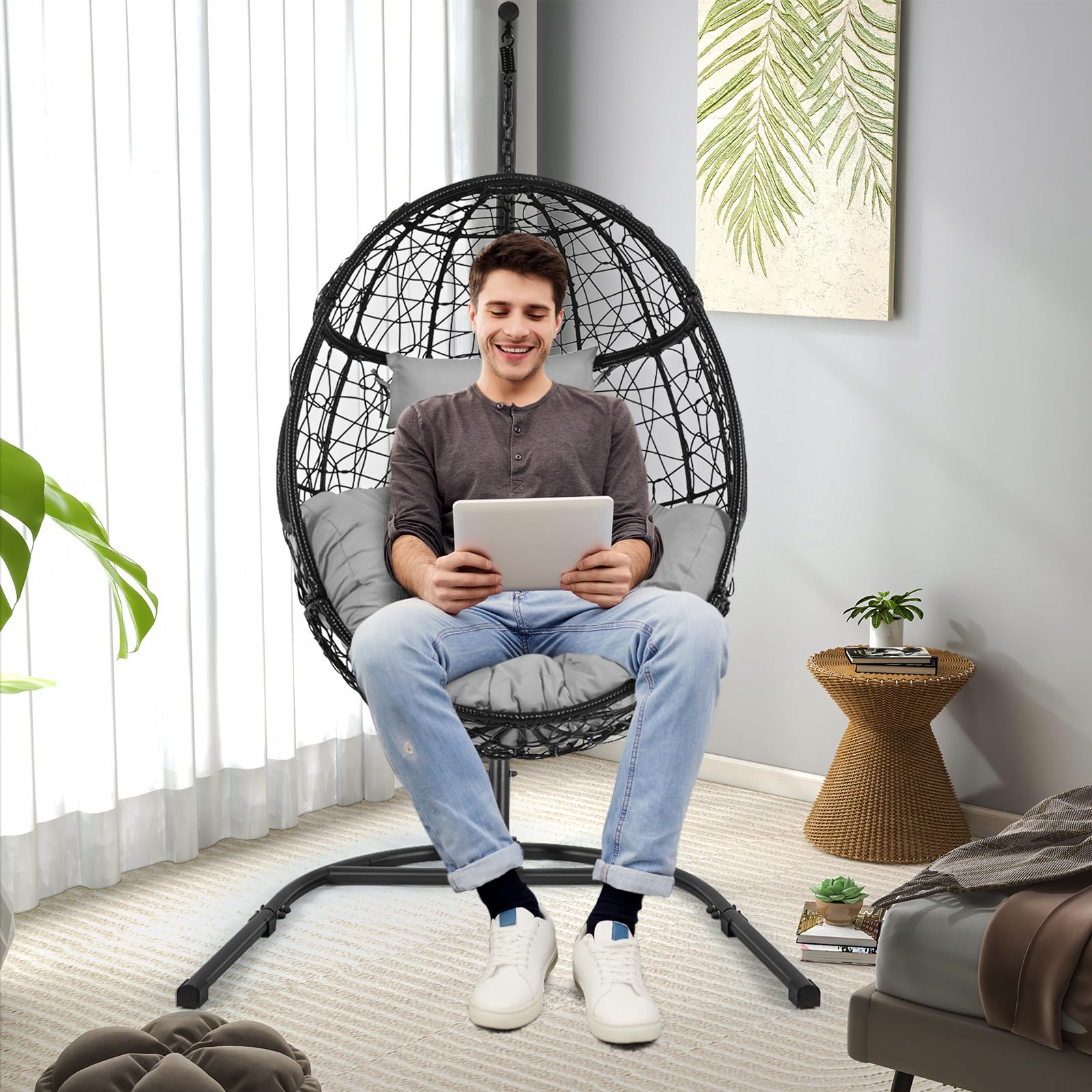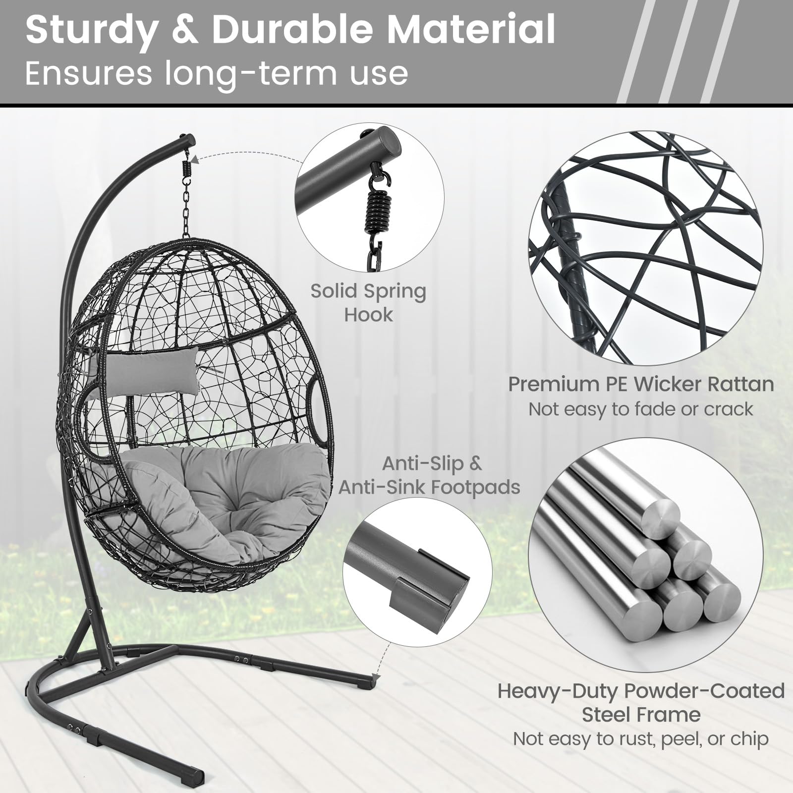 - Sturdy & Durable Material: The hanging egg chair is wrapped by premium PE wicker rattan, which is not easy to fade or crack, ensuring long-term outdoor use. And the stand is constructed of heavy-duty powder-coated metal, which is not easy to rust, peel, or chip, ensuring excellent sturdiness.