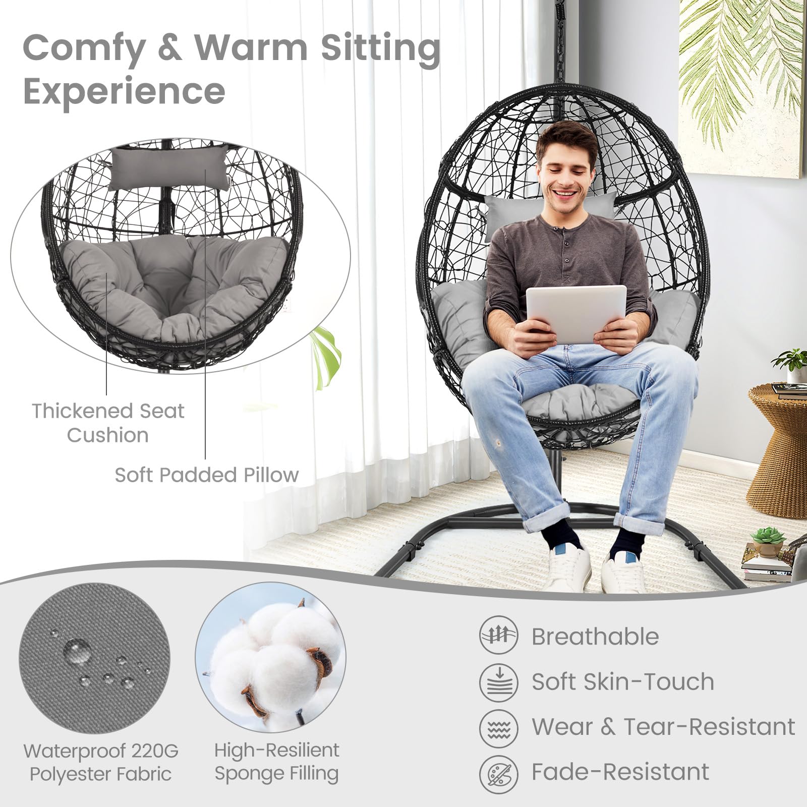 - Comfy & Warm Sitting Experience: The egg chair is designed with a thickened seat cushion and a soft padded pillow. And with the high-resilient sponge filling and breathable polyester fabric covering, it would provide an ultra-comfortable sitting experience. Besides, the egg chair shape can perfectly fit your body curve for better relaxation.