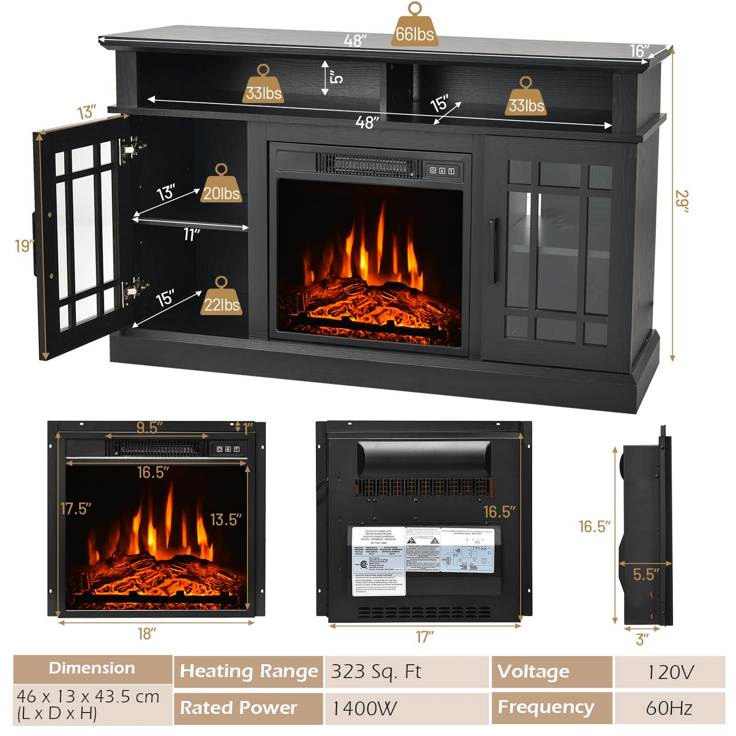 - Installation Required: With detailed instructions and complete hardware, you can assemble the TV stand and install the fireplace correctly. Furthermore, two anti-tilt straps are provided for higher safety. Dimension of TV stand: 48” x 16” x 30” (L x W x H). Dimension of Electric Fireplace: 18” x 5” x 17” (W x D x H).