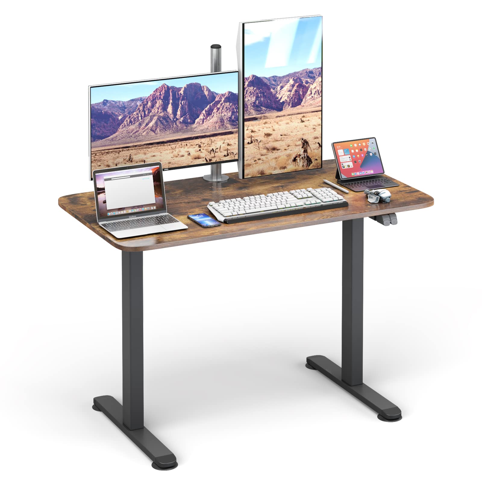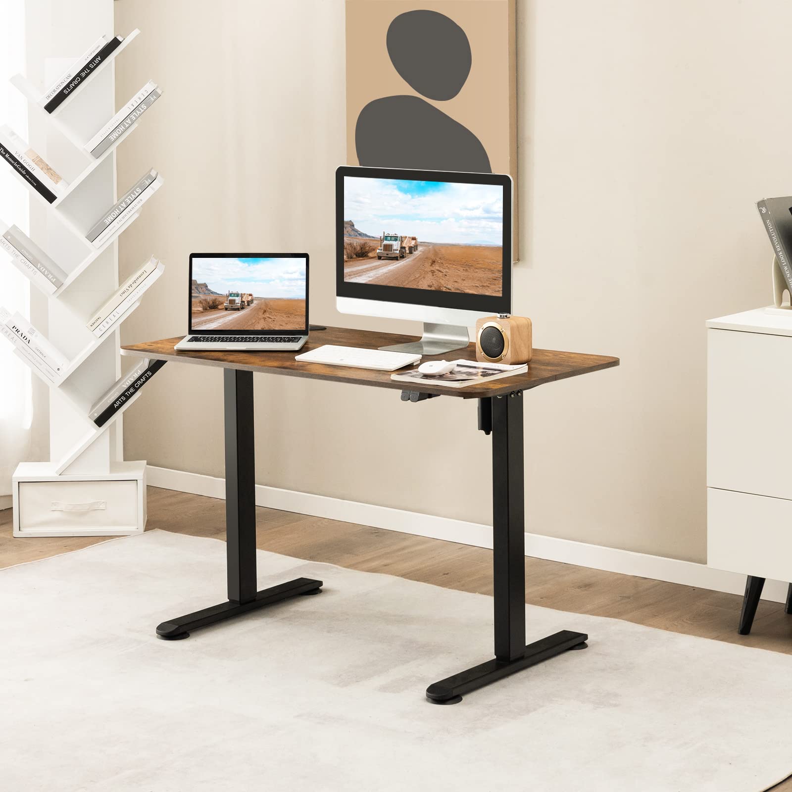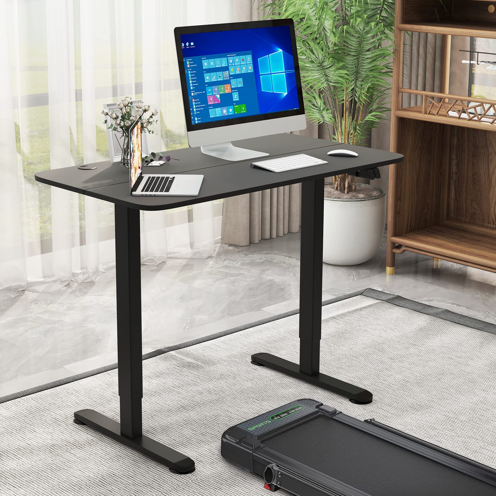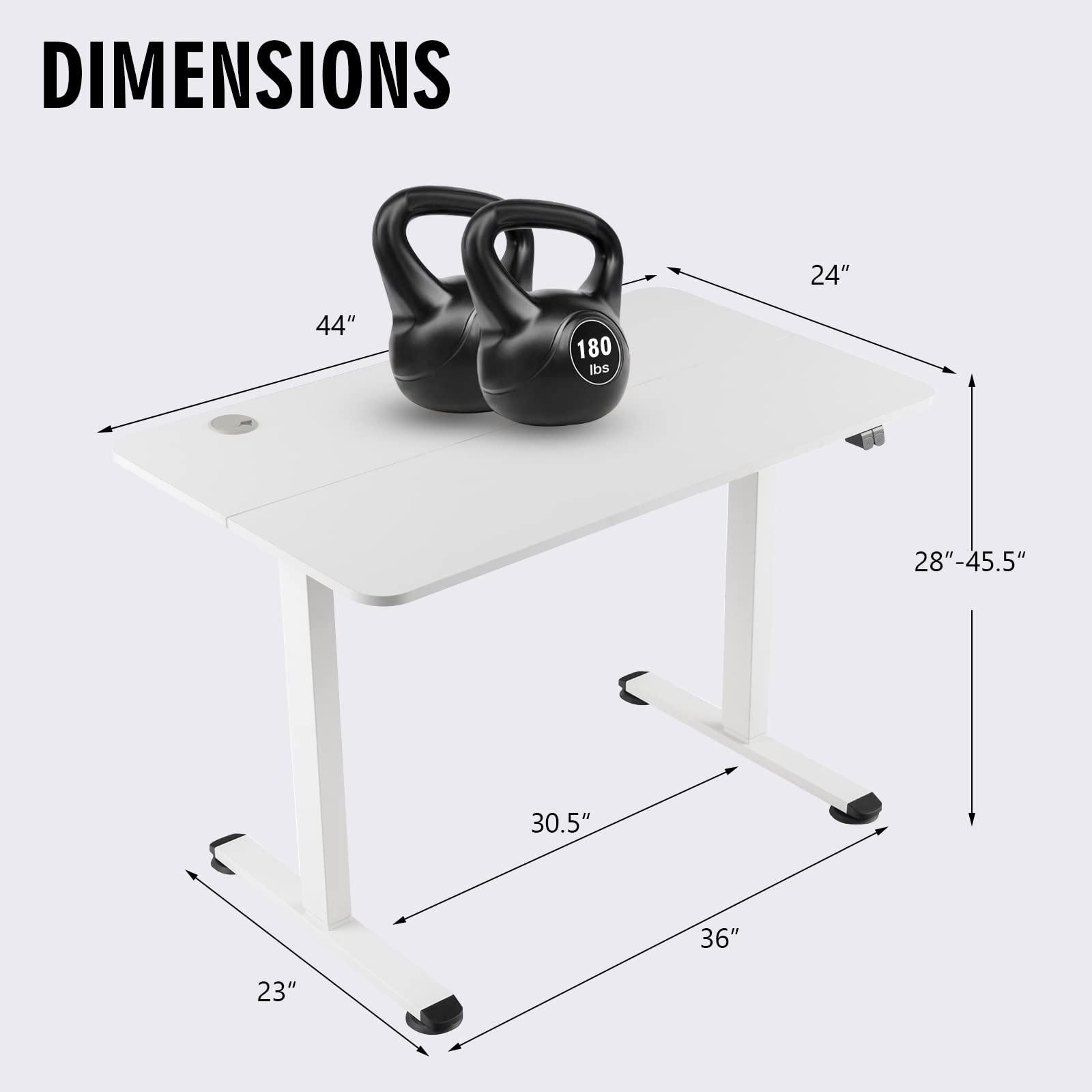 Are you suffering from longtime sedentary work? Add this electrically height-adjustable desk to your home office and welcome a pleasant change! Powered by a premium motor, this ergonomic computer workstation can go up and down from 28" to 45.5" offering ideal positions for all user groups. If you want to do exercise during work, just press the button and adjust it to the appropriate height that matches your fitness equipment. 44"x 24"work surface is wide enough for working, reading, or any other activity. What's more, the overall construction of the standing desk is sturdy and durable. The robust metal legs can support up to 180 lbs. Together with the adjustable foot pads, the computer desk can stand on its own without wobbling.