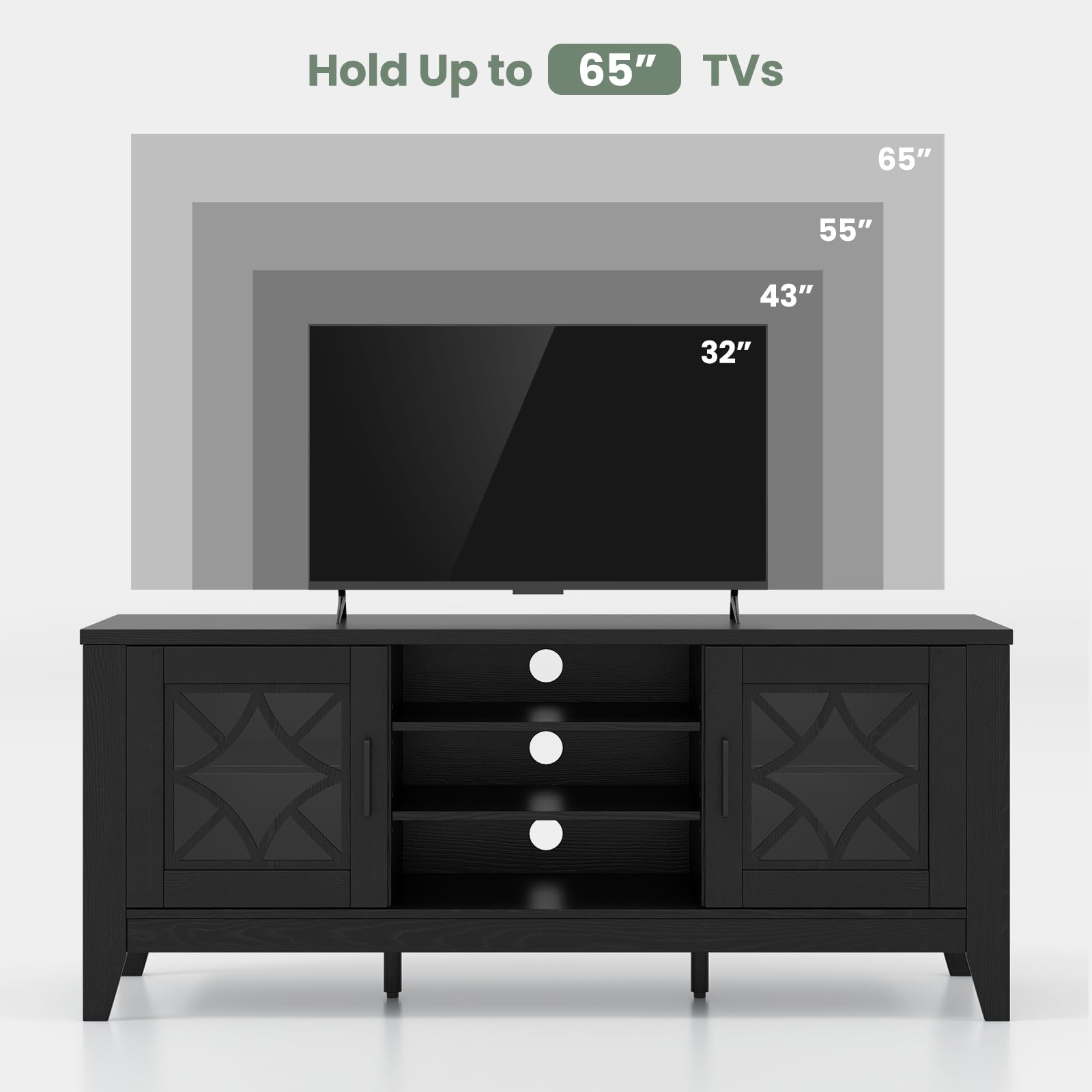 Unveil the pinnacle of entertainment with our TV stand?Dwhere grandeur meets practicality. Imagine your 65-inch TV basking on a robust top, with ample space for all your entertainment extras. This media cabinet also boasts flexibility of 4 adjustable shelves, tailor-made for your gaming consoles and media players. Tidy cables disappear through 3 rear holes, keeping your space sleek. Marvel at the geometric glass doors that frame your media collection with sophistication. Plus, with extra support legs and non-slip pads, enjoy a stable, scratch-free addition to your home. Upgrade your living room with style and substance.