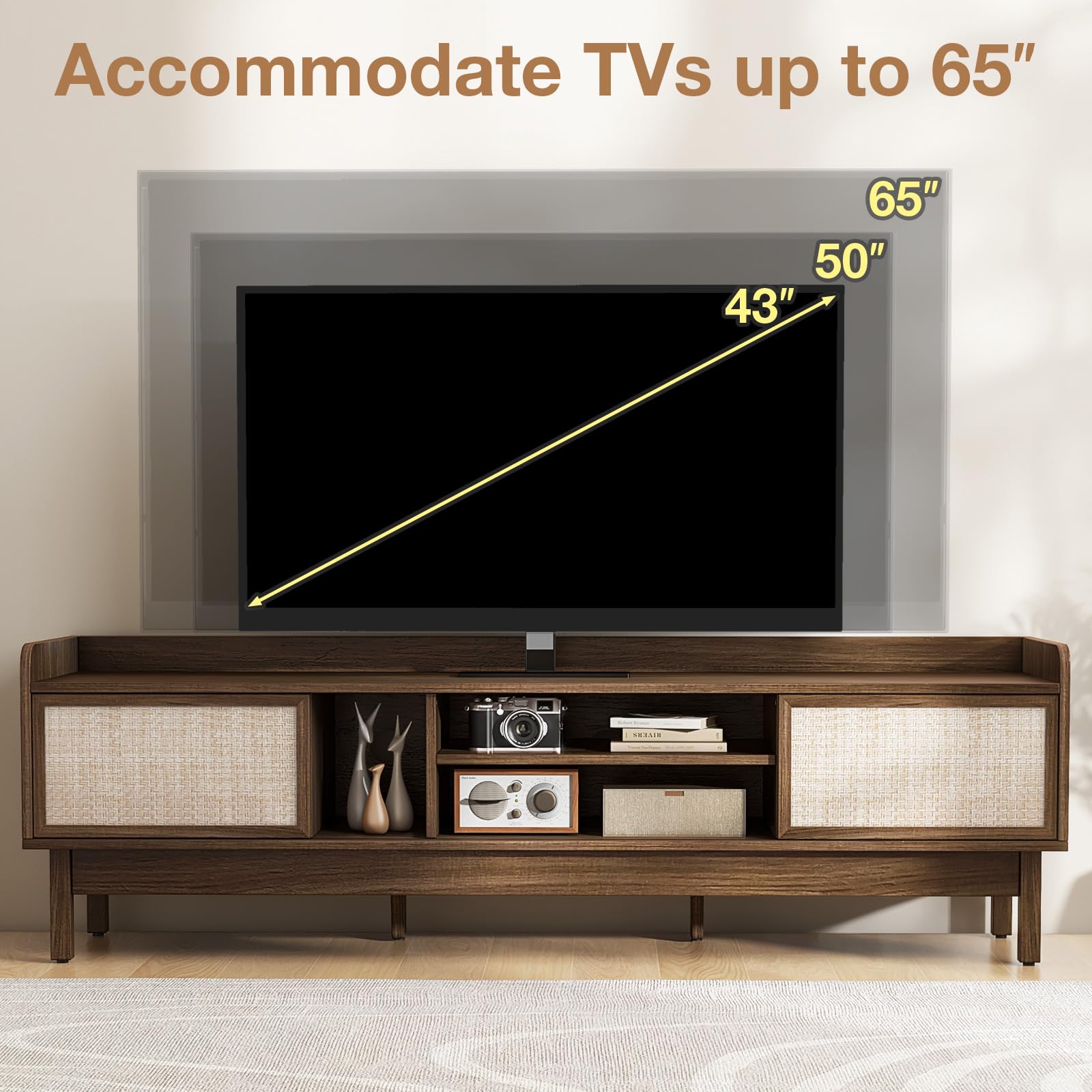 Immerse yourself in mid-century modern charm with this stylish TV stand featuring unique woven doors that add artistic elegance to your decoration. With large storage space and smooth sliding doors, this entertainment center offers both functionality and aesthetic appeal. The adjustable shelf is 3-position available for different sized items. Built for stability with 6 support legs and non-slip foot pads, it ensures your electronics are securely held. Say goodbye to cable clutter with integrated management holes, creating a tidy and relaxing entertainment space for your viewing pleasure.