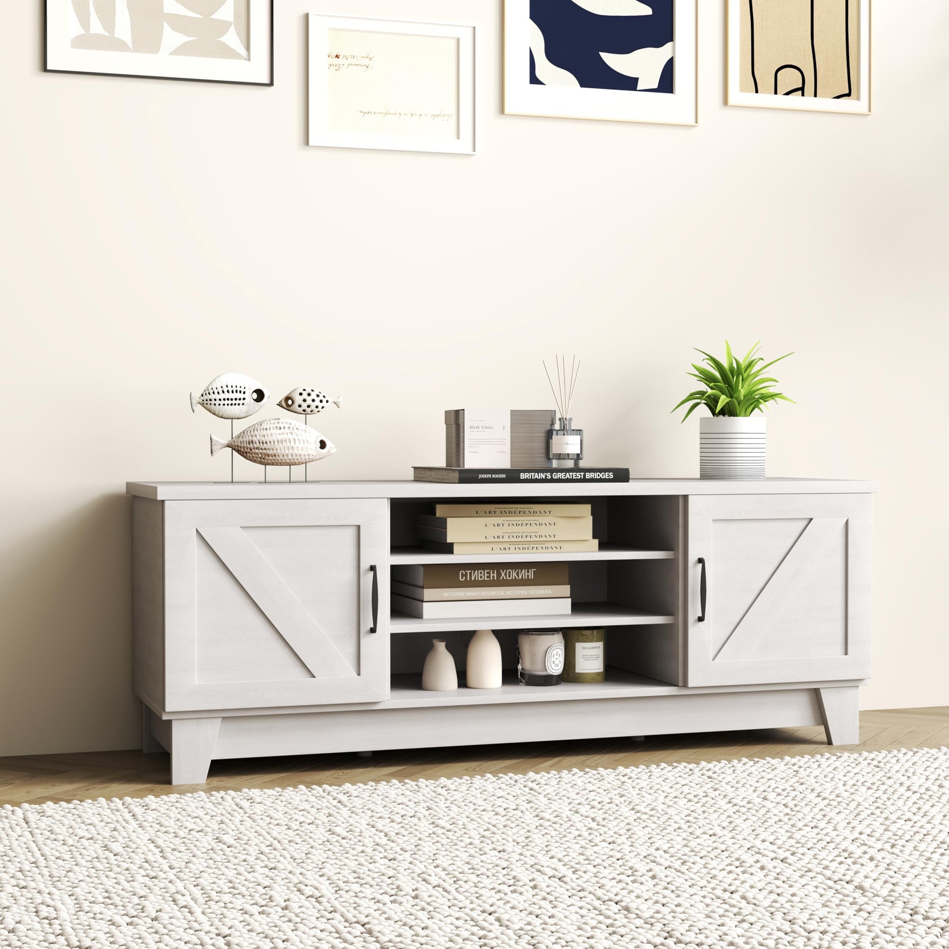 - Farmhouse Barn Door Design: Featuring double barn doors and a delicate wood grain finish, the rustic wood TV stand brings warmth and character to any space. Designed to function as a TV stand, entertainment center, or stylish storage cabinet, it seamlessly enhances the decor of your living room or bedroom.