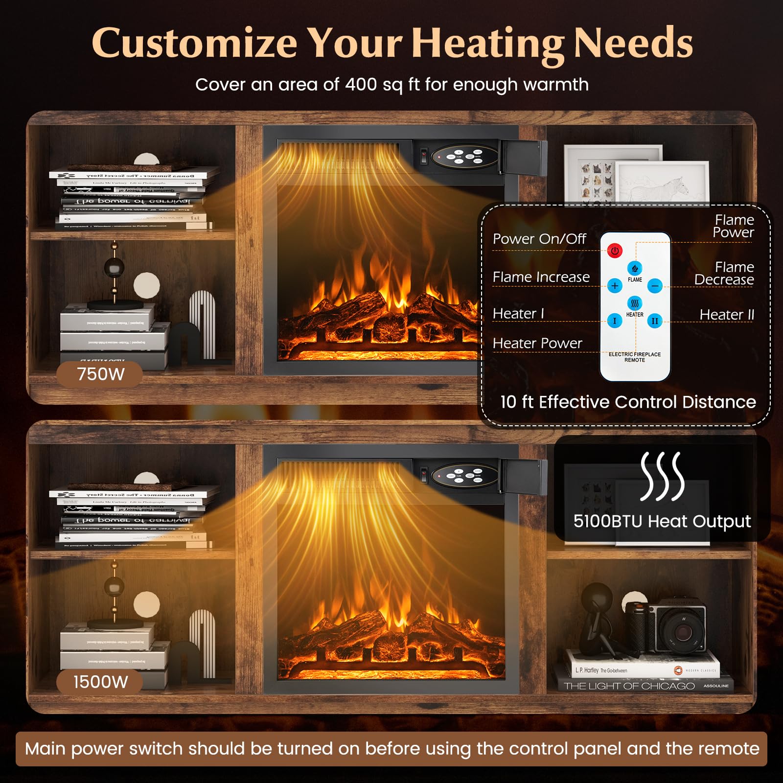 - Customizable Heat: This electric fireplace allows you to choose between a low 750W or a high 1500W setting, suiting your comfort level. Besides, the 5100 BTU heat output covers an area of 400 sq ft for enough warmth. This fireplace also features a sleep mode to keep you warm without any light.
