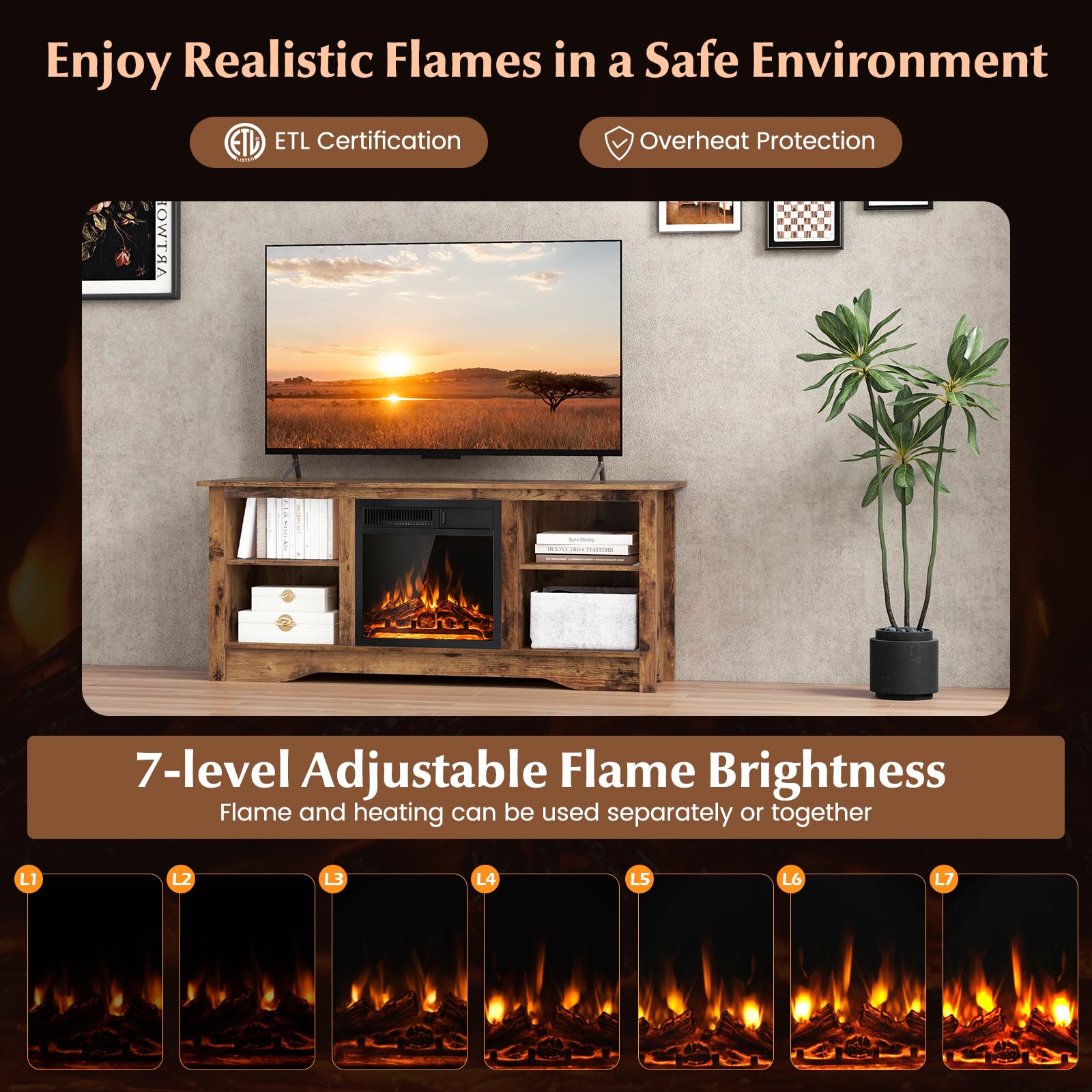 - Reliable Fireplace TV Stand: Apart from the ETL certification, this electric fireplace heater also comes with overheat protection to make it safer for year-round usage. And the stable base of the entertainment center is designed for strong stability.