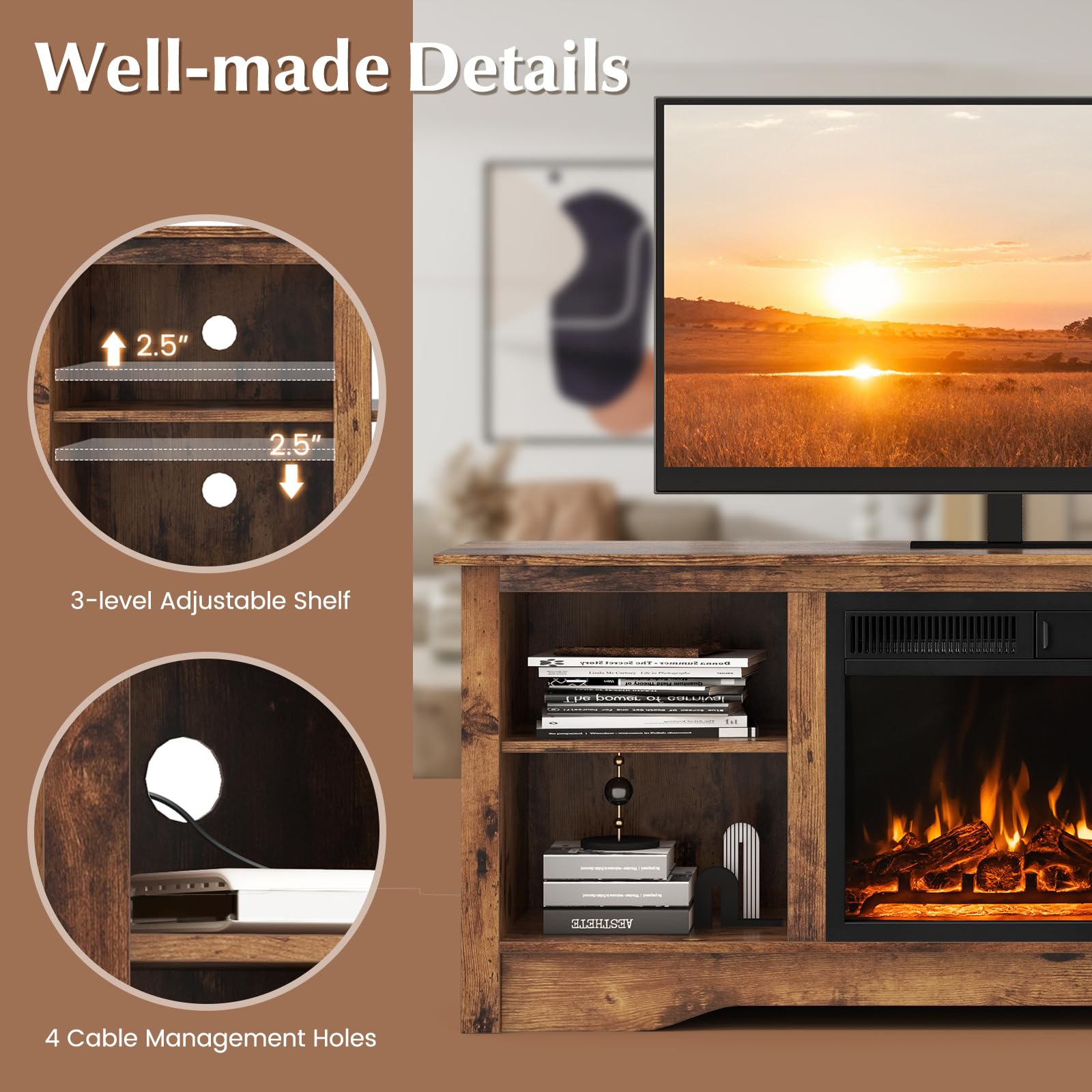 Immerse yourself in the tranquil ambiance of flickering flames whose brightness is 7-level adjustable without any smoke or mess. Whether it's a chilly evening or just for the mood, this fireplace heater with a customizable 750W/1500W setting and 5100 BTU heat output ensures your space always at the perfect temperature, conveniently controlled by a handy remote. No matter how long you use it, the overheat protection will always keep you safe. As for the TV stand, it features adjustable shelves that neatly house all your entertainment essentials, while the tabletop accommodates 65 inches flat screen TVs.