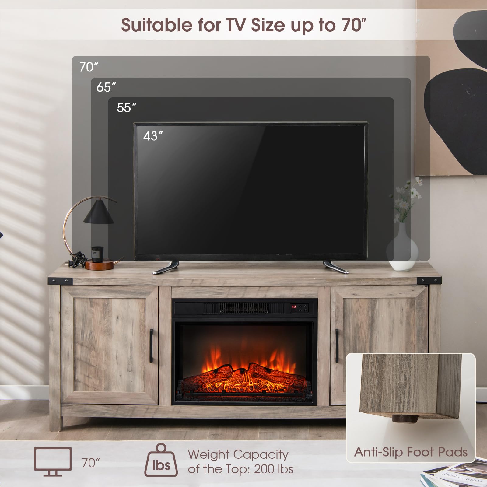 The removable 23-inch fireplace insert allows you to stay warm and comfortable in cold winters. Also, you can appreciate the realistic 3D flame through the tempered glass without heat. And you are able to select different flame brightness (L1-L3) and temperatures (62-82℉) by both the control panel and the remote control. The clear LED display indicator shows the real-time temperature. More importantly, the 0.5-6 hour timer provides you with a sound and peaceful sleep all night. As for storage purpose, the capacious tabletop holds a TV up to 70 inches. Meanwhile, the enclosed cabinets with 3-postion adjustable shelves fits items of different heights.