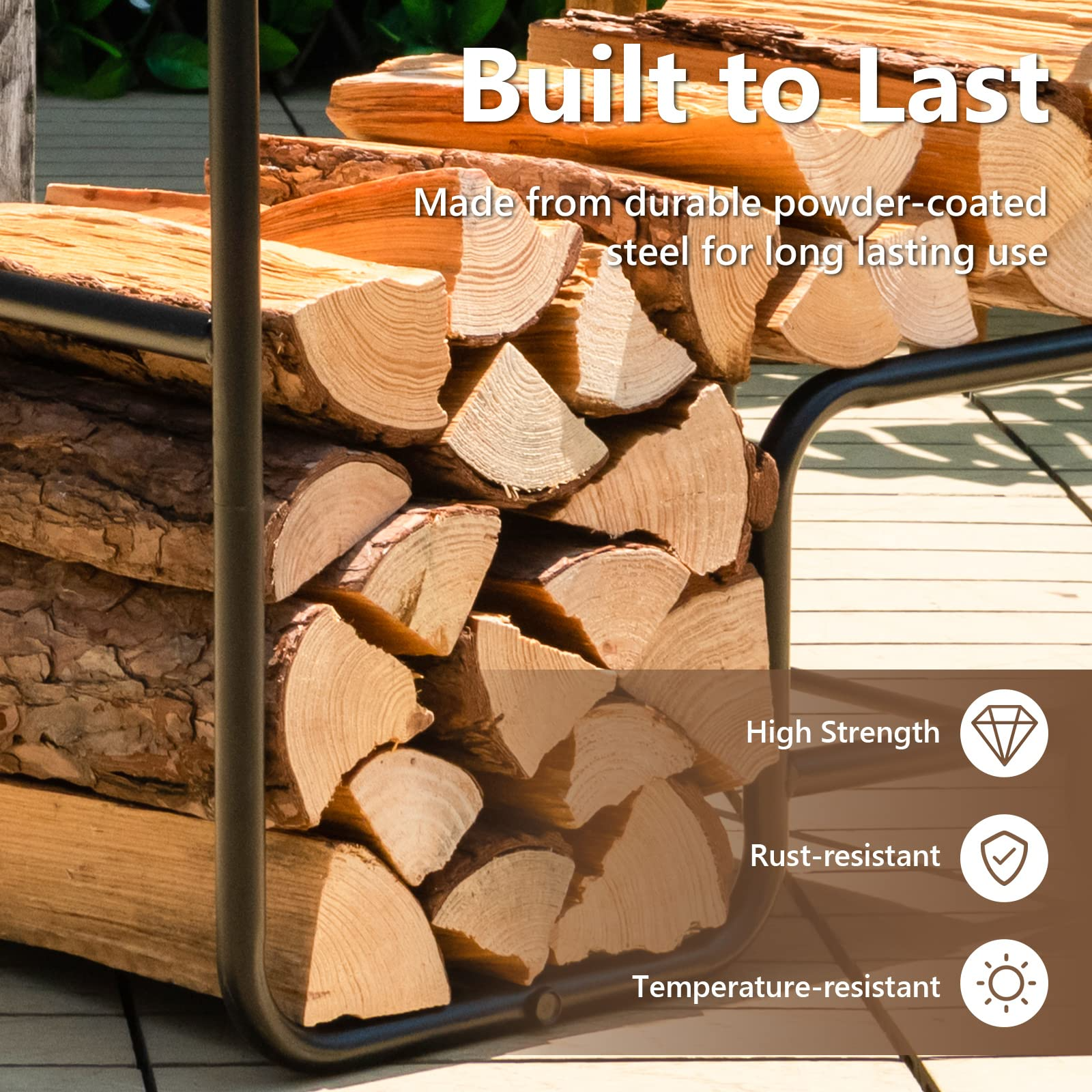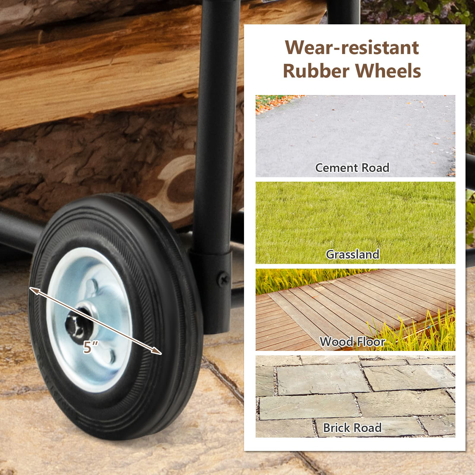 • Easy to Handle & Transport: This firewood rack features 2 rubber wheels and an ergonomic handle to make it easy to carry logs everywhere, saving you time and effort.?The 5 inches large wear-resistant wheels can conquer a variety of roads, whether it is a stone brick road, cobblestone road, or grassland. The wheels will not make noise and avoid floor scratches.