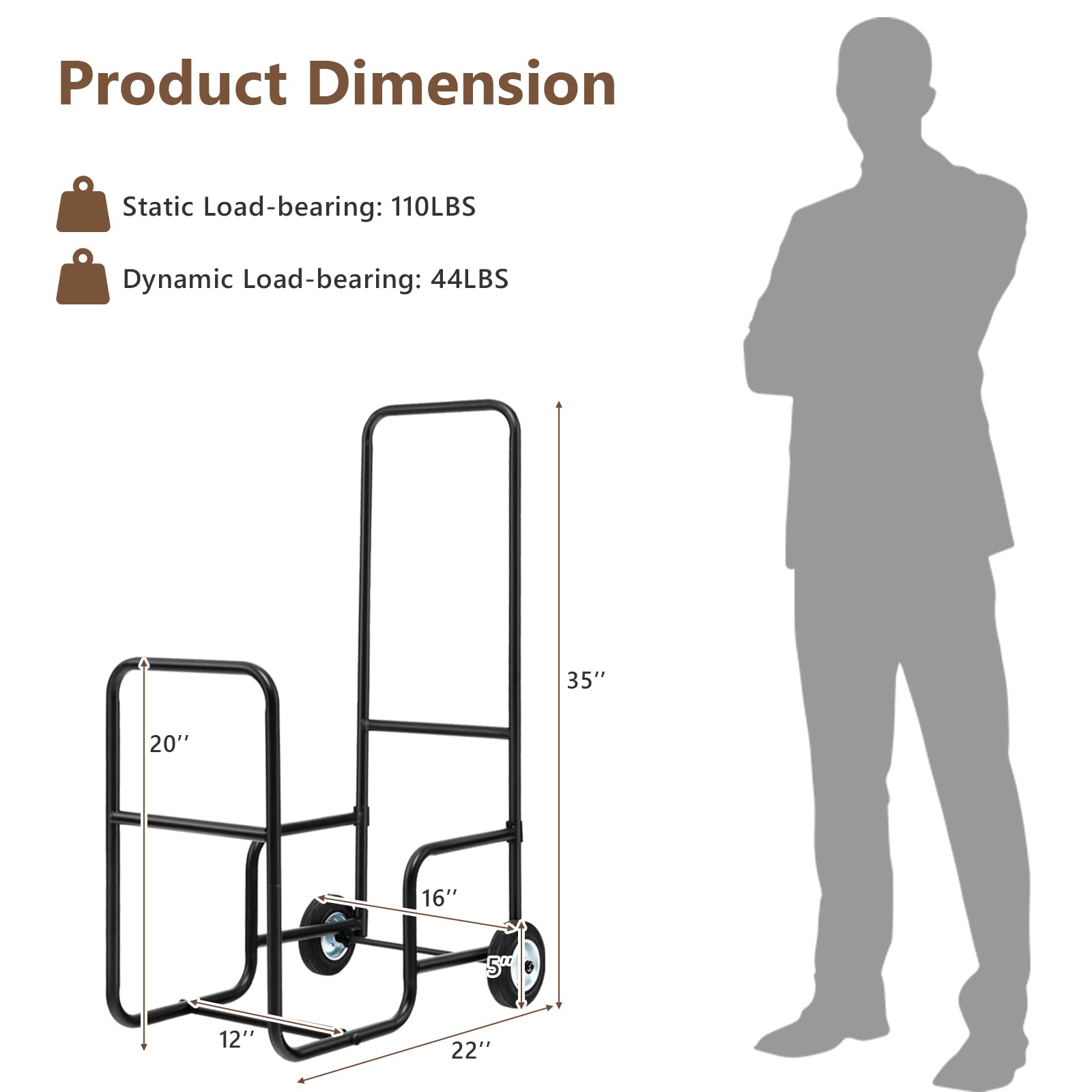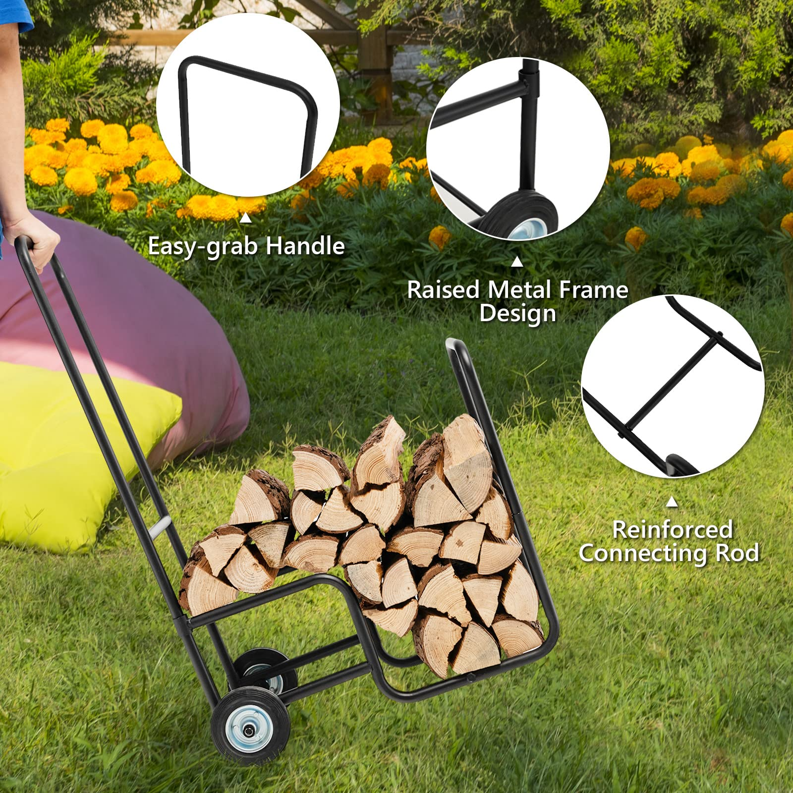 Looking for a convenient cart to transport wood Try out this firewood log cart carrier. Made from powder-coated steel tubing and solid connection rods, this rolling firewood log cart ensures stability and durability for long-lasting use. Under static conditions, the cart can hold up to 110 lbs. The smart design of our firewood log cart carrier has more capacity, which can lay down a lot of wood. With rubber rolling wheels and an easy-grip handle, the firewood log cart carrier is convenient to pull and move anywhere. Our rolling firewood cart can be used to carry firewood or as a tool to store firewood. It is perfect for your home's fireplace or outdoor fire pit, also great to fit outdoor porches and backyard fire pits.