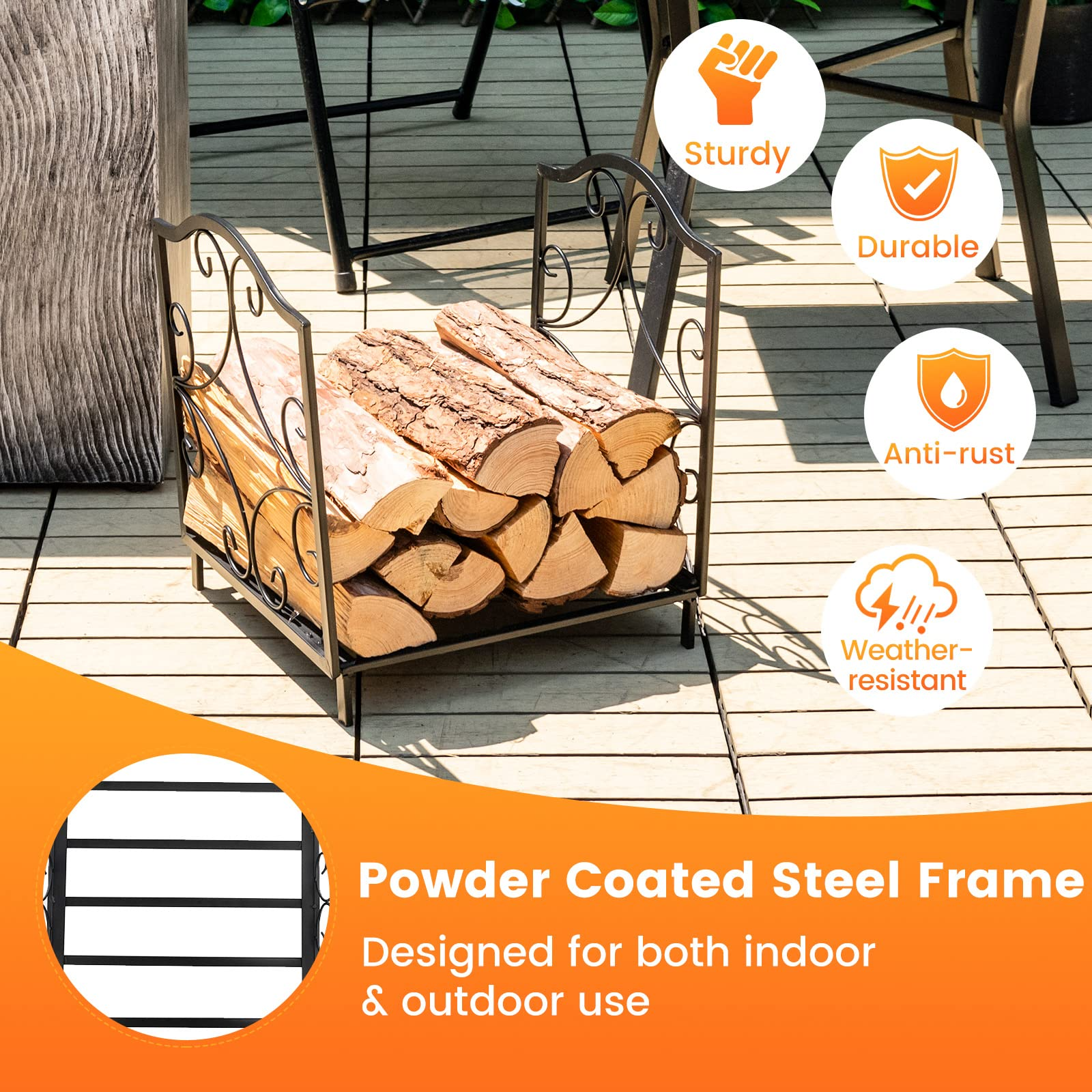 - Stable Structure & Long-term Use: Supported by a powder-coated steel frame, this decorative firewood rack is sturdy, anti-rust, weather-resistant, and durable for indoor and outdoor use. In addition, the bottom anti-slip foot pads not only increase stability but also help to protect the floor from getting scratched.