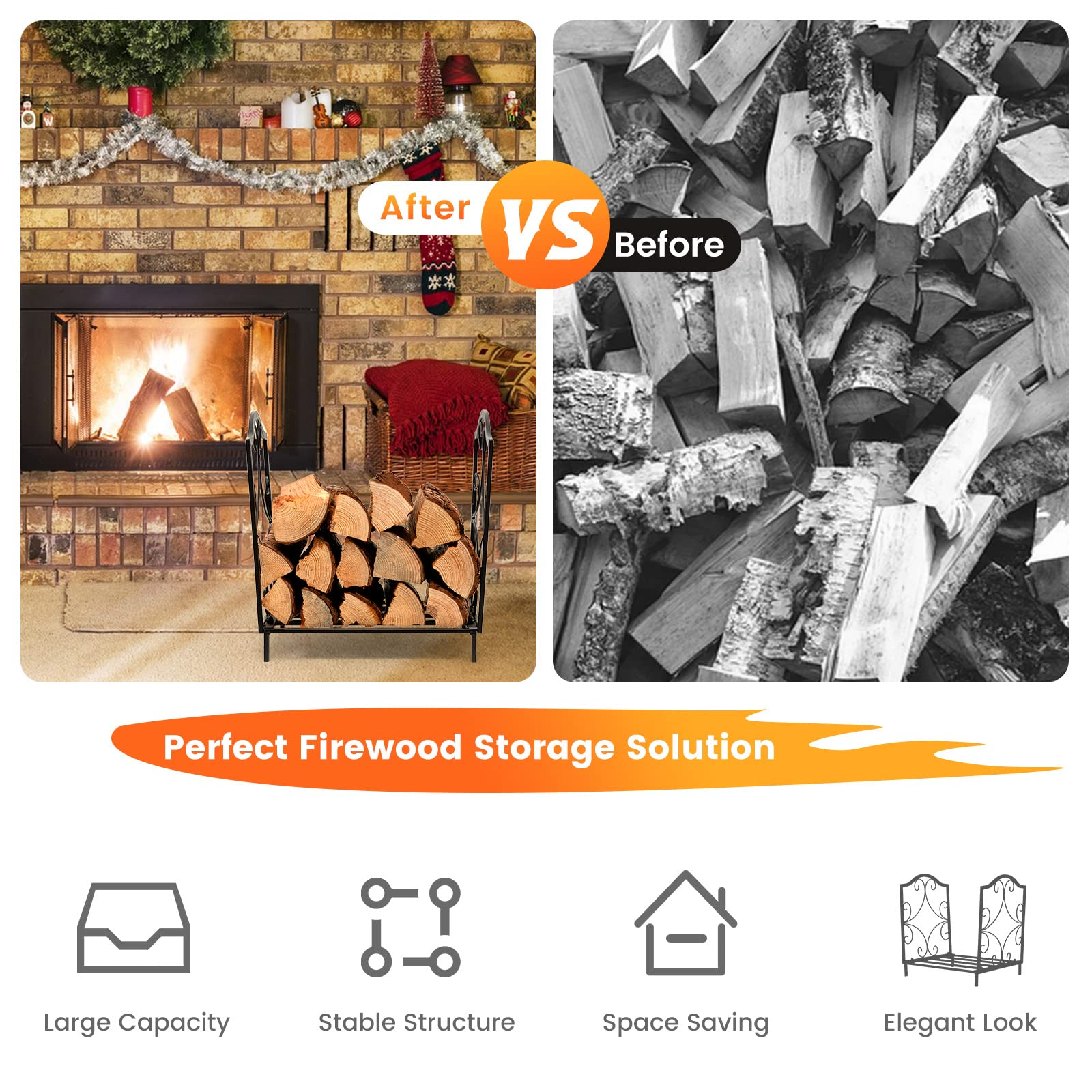 - Elegant Look & Lightweight Design: Designed with exquisite and elegant patterns on both sides, this firewood storage stand can be a beautiful decoration for your home fireplace or outdoor area. Moreover, this compact firewood rack weighs only 3.5 lbs, which allows you to move it to any place you want effortlessly.