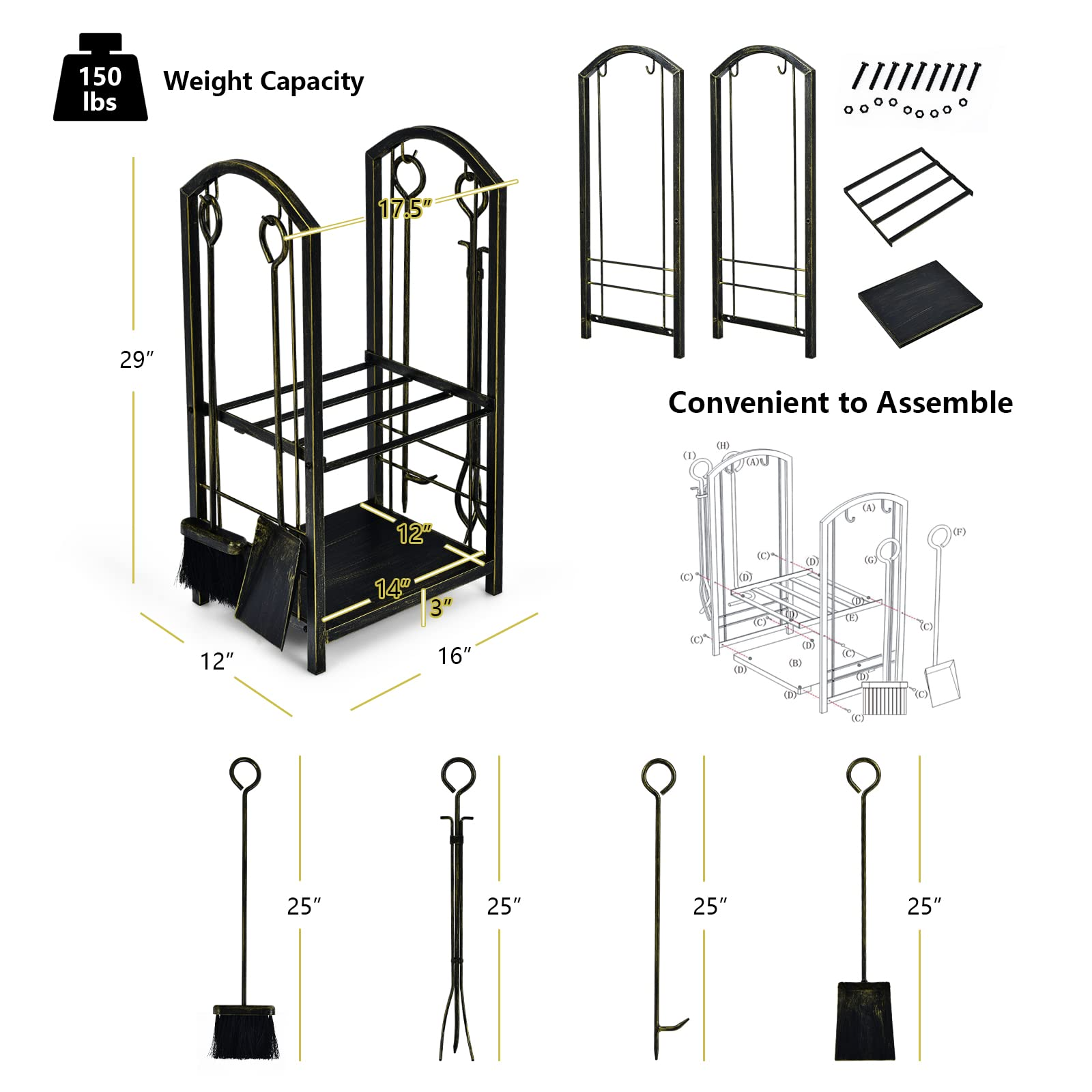 - Fireplace Essential Overvalued Five-piece Kit: The fireplace tools set comes with a firewood rack, brush, shovel, tongs, and poker which can withstand flames, safely move firewood, and keep the fireplace area tidy and clean. It can coordinate with most fire screens, log holders, racks, or outdoor fire pit tools. It's essential for the fireplace.
