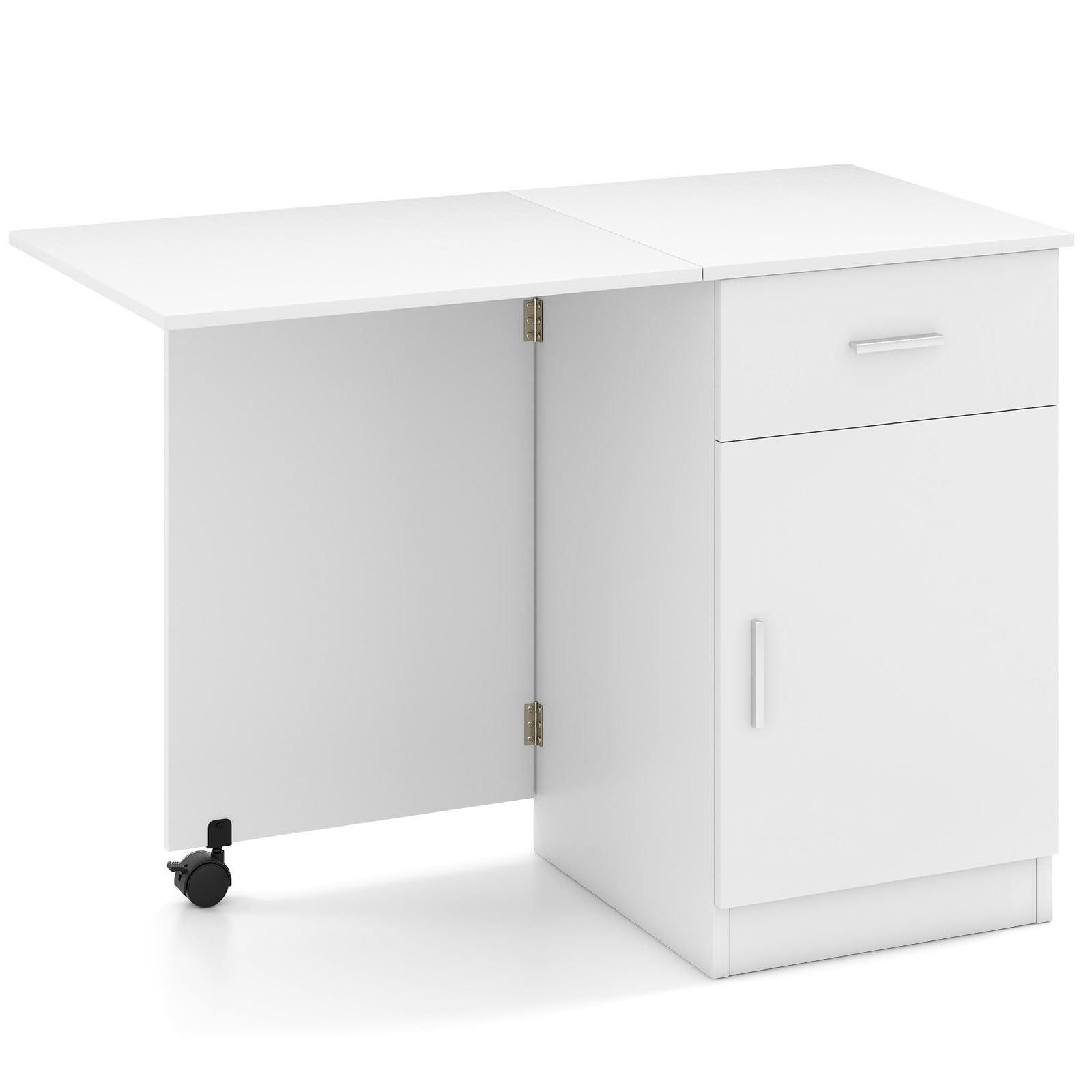 Upgrade your home office with our versatile space-saving folding desk, perfect for compact storage in small rooms. The drop-leaf table allows for easy transformation into a writing desk or end/side table, providing flexibility. With ample storage space, sturdy construction, and a tabletop capacity of 165 lbs, this desk offers reliable support for your essentials. Lockable wheel enables you to enjoy flexible mobility of tabletop. The modern style with clean lines and chic appearance blends seamlessly with various home decoration styles. Moreover, the user-friendly details showcase better workmanship. The metal hinges help you to open and close the door, while the smooth and water-proof surface is easy-to-clean. Versatile and stylish, this desk can be used as a computer desk, writing desk, study desk, or vanity table in your living room, bedroom, or study.