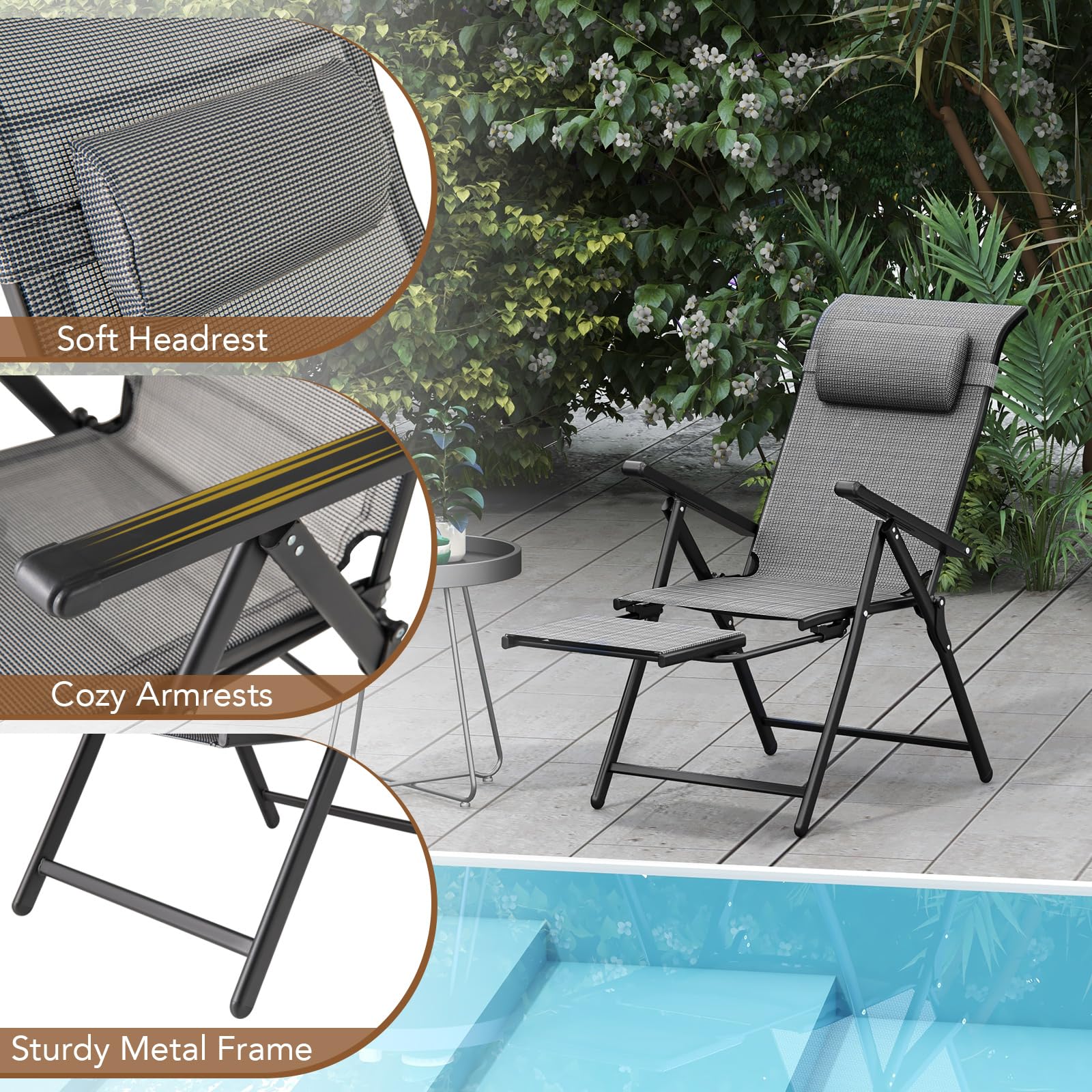 The outdoor lounge chairs are designed to provide ultimate relaxation with their adjustable backrests and armrests, allowing you to find your ideal position for reading, sunbathing, or relaxing. Supported by sturdy metal frames, these patio folding chairs offer exceptional stability and support. The retractable footrests add an extra level of comfort for your legs, and can be folded underneath the chairs to save space. Made with breathable and quick-drying fabric, these folding lounge chairs ensure a comfortable seating experience even on hot days. Perfect for your patio, backyard, poolside, or outdoor adventures, these folding lounge chairs are easy to move, transport, and store thanks to their foldable design. Additionally, no assembly is required, making these chairs ready to use right out of the box.