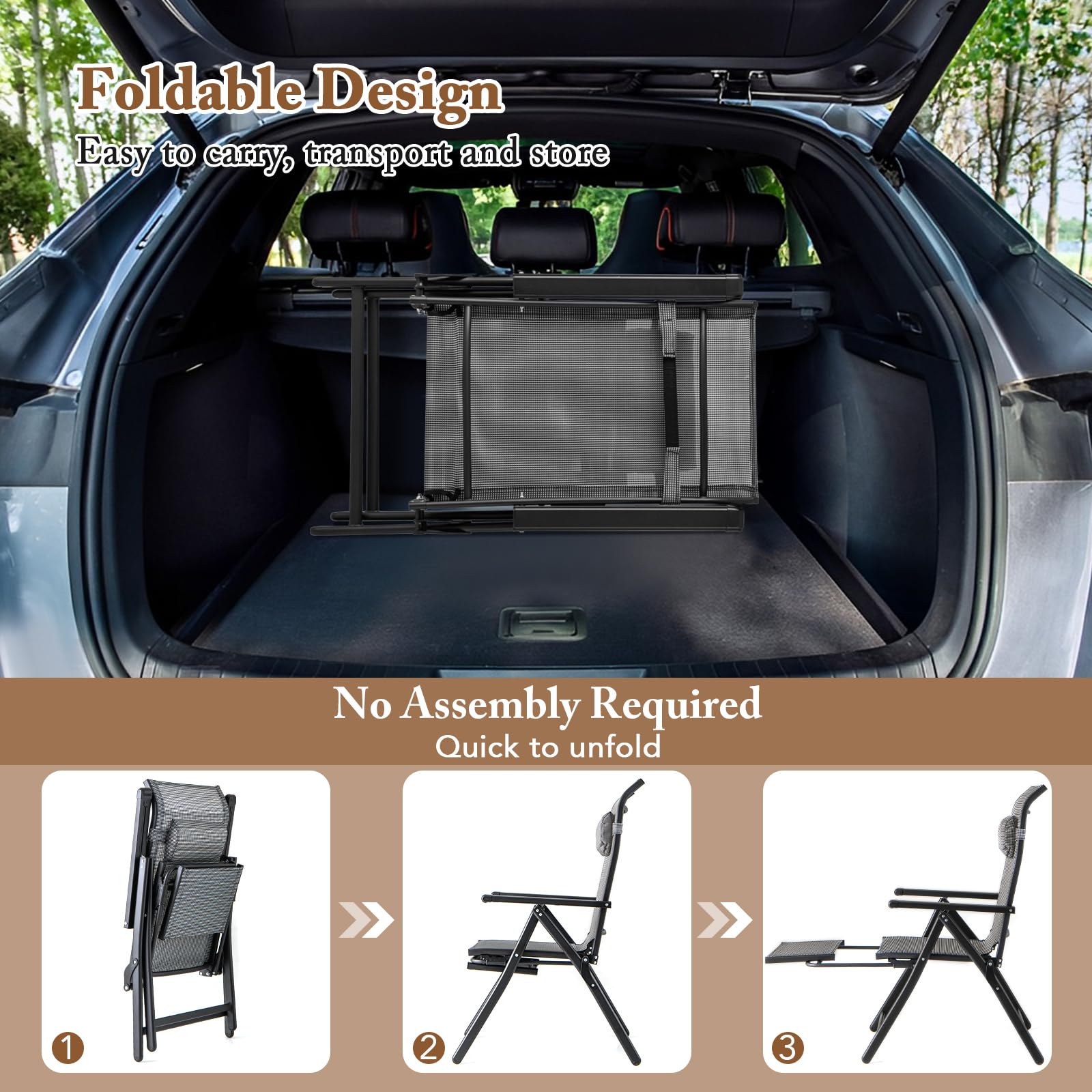 • Retractable Ergonomic Footrests: The folding patio chairs are equipped with retractable footrests, providing you with added support for your legs. When not in use, the footrests can also be folded under the chairs, saving space and accommodating different requirements.