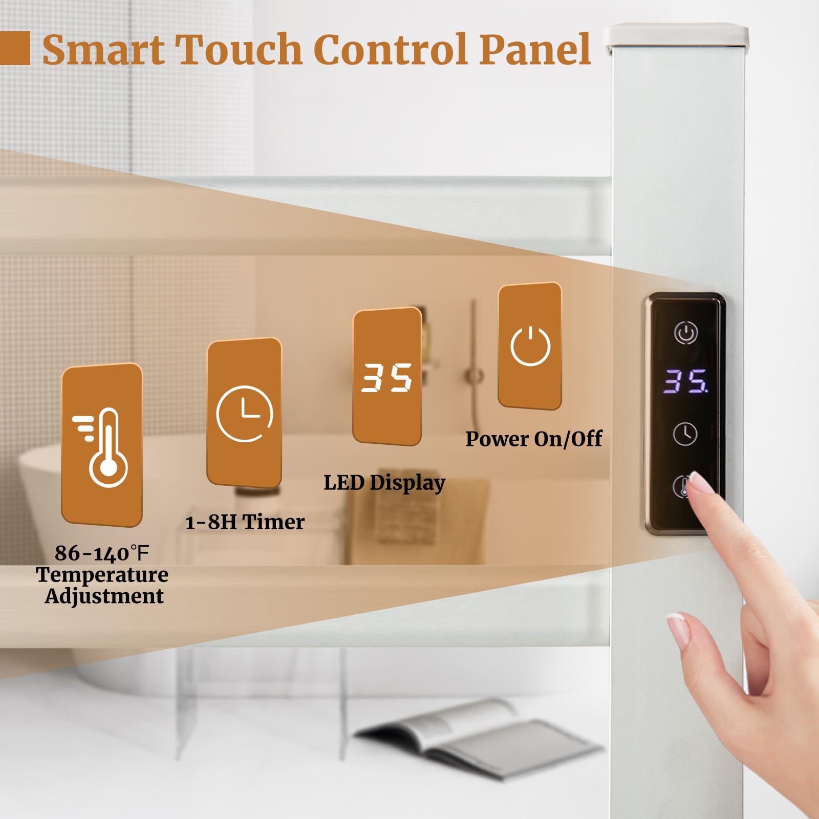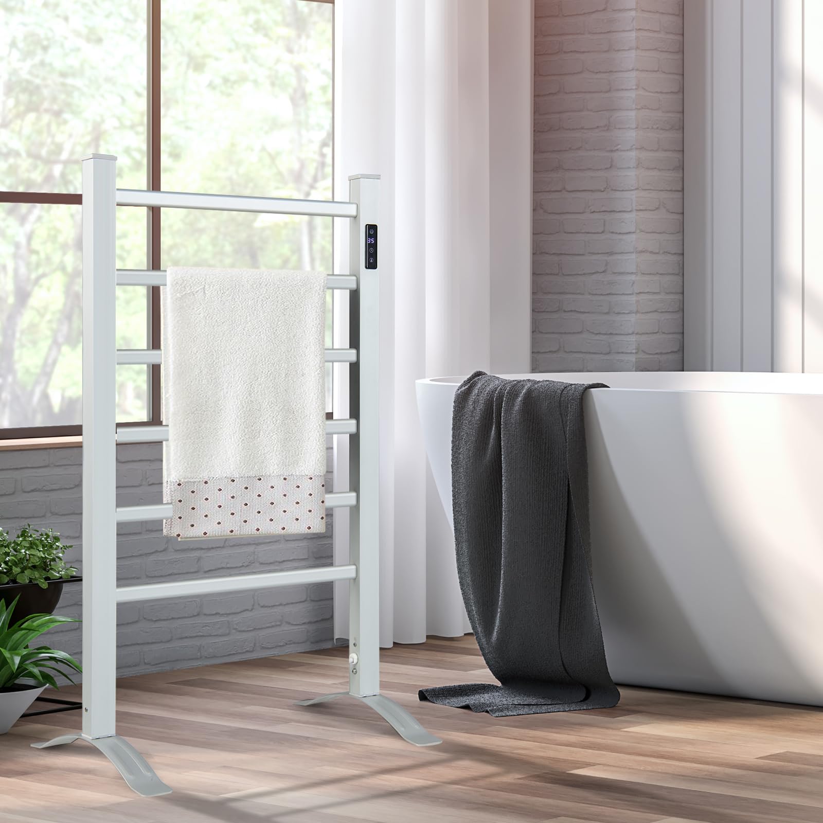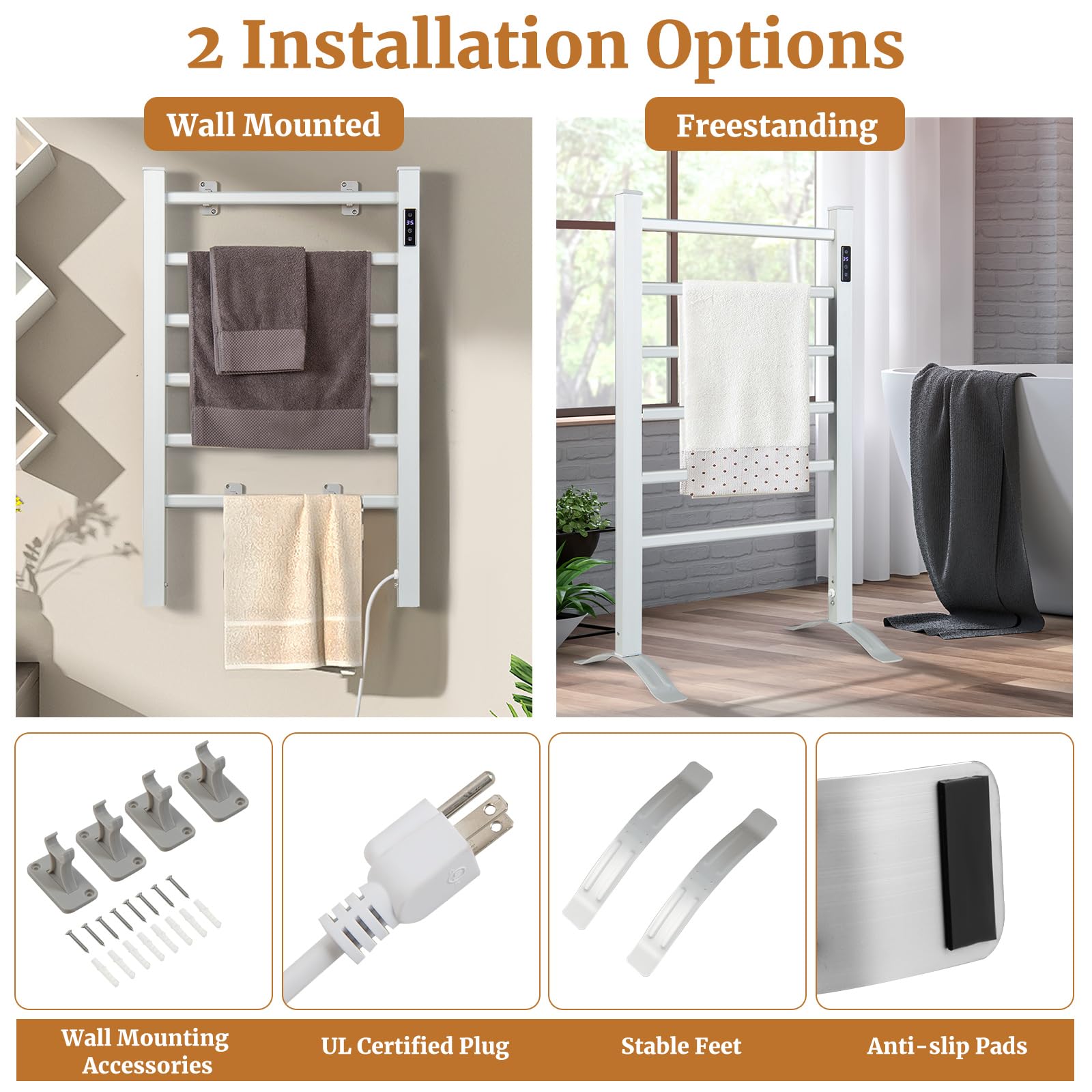 This towel warmer rack heats up quickly and reaches the highest temperature of 140°F within 10 minutes, making you and your family embrace the comfort of a warm towel after every bath or shower. Designed for versatility, the towel warmer can be wall-mounted to save space or used as a freestanding unit for flexible placement. All the necessary parts and hardware are included in the package for easy installation. Besides, the towel drying rack comes with an 8-hour timer and LED display, allowing you to heat up your towels and have them ready precisely when you need them. The built-in overheat protection and constant temperature control offer high safety and reliability without excessive power consumption.