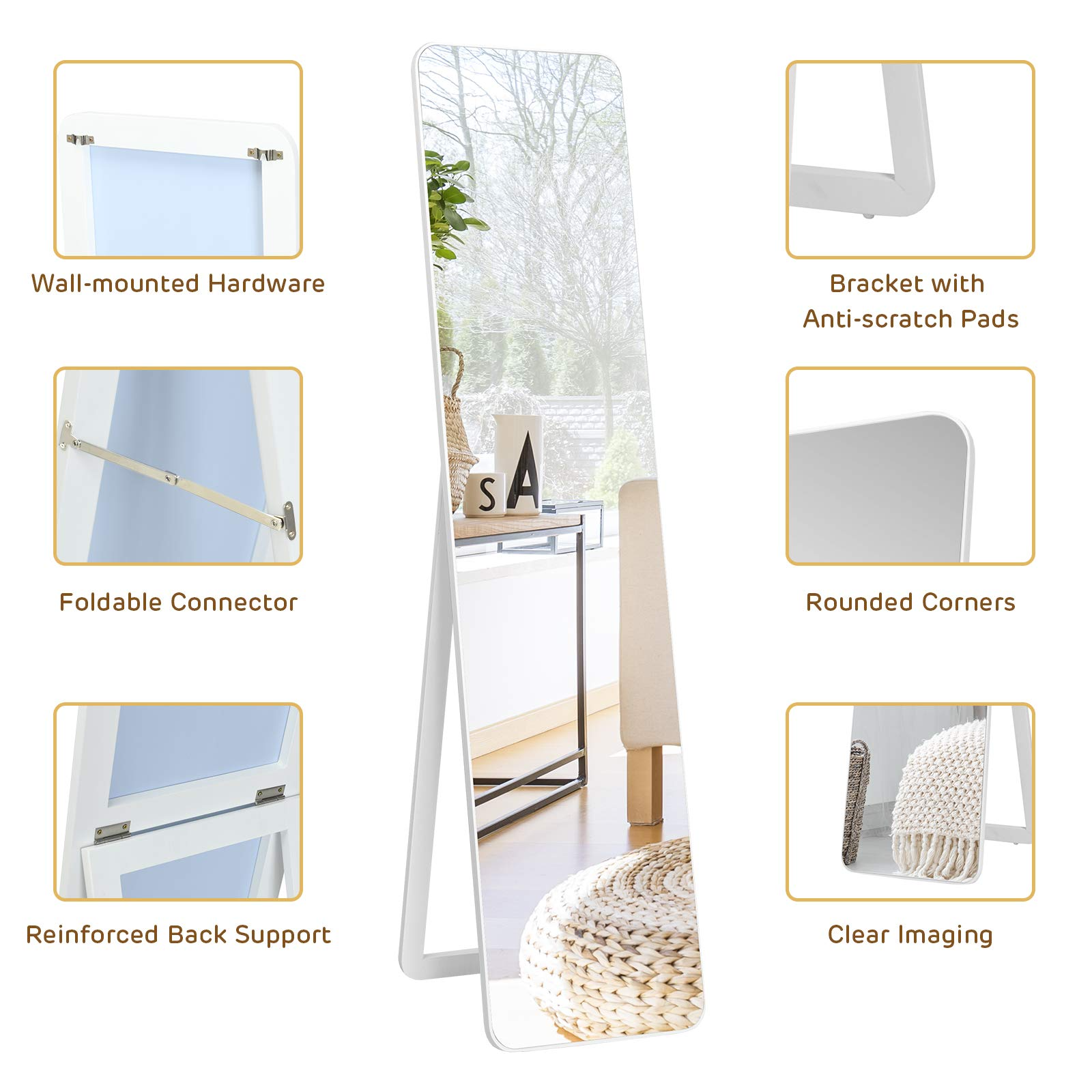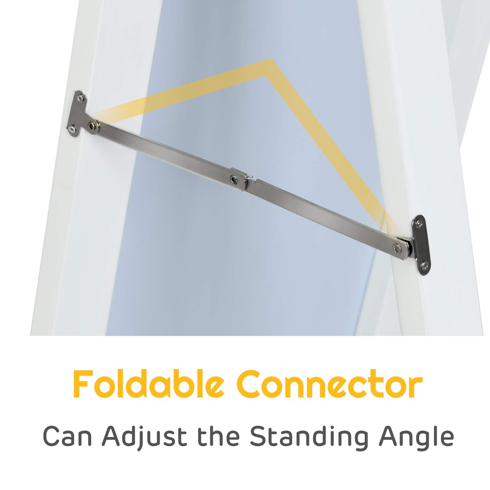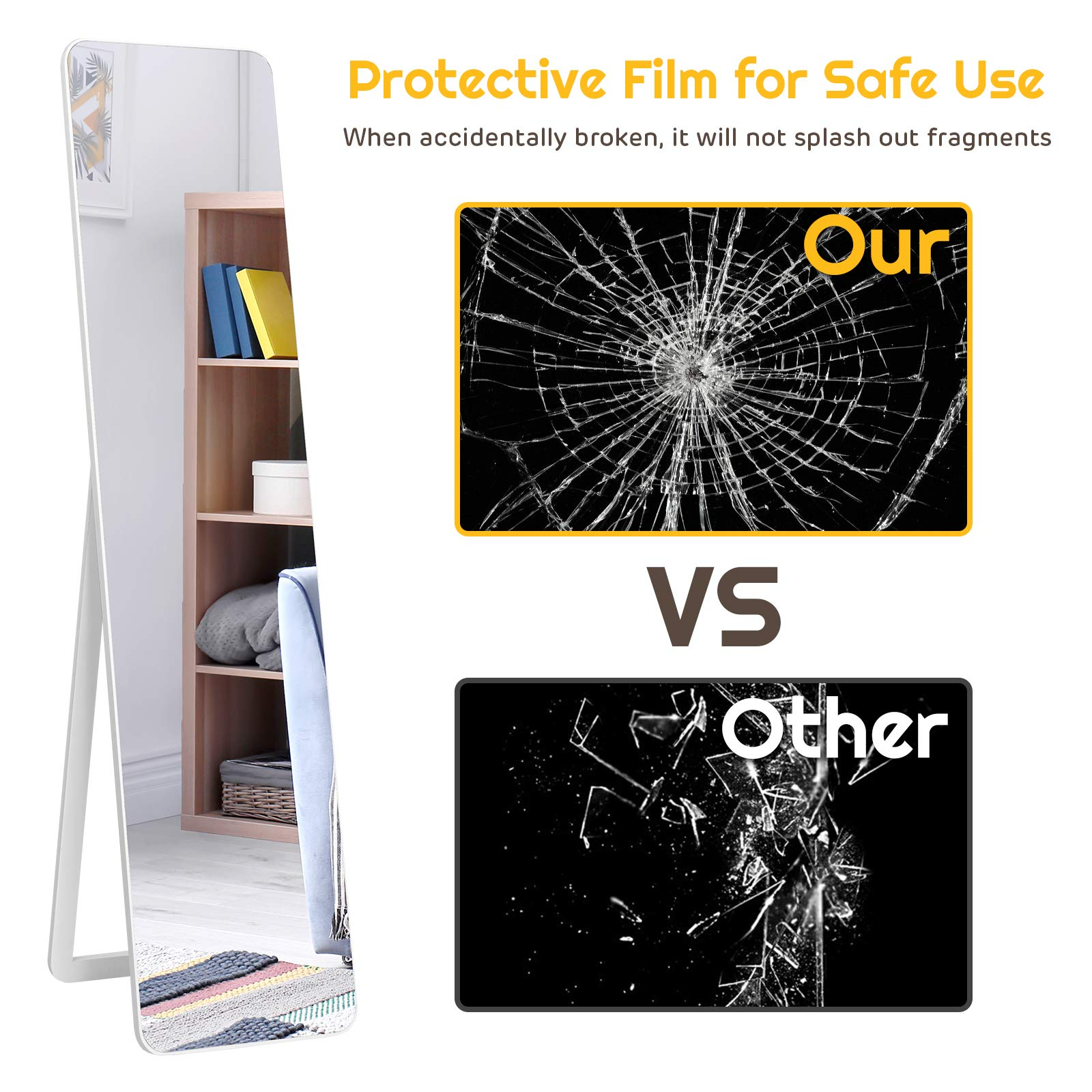 This is our standing/hanging full-length mirror, which will magnify your beauty from head to toe. The solid wood frame is sturdy and durable without easy cracking. The glass with explosion-proof film provides HD imaging and can prevent fragments from splashing when impacted by external forces. A U-shaped bracket ensures that the mirror stands stably, and the foot pads at the bottom can prevent scratches on the floor. Worth mentioning that with hooks and expansion screws included, you can also choose to hang our mirror on the wall to save space. In addition, the simple and modern appearance allows this mirror to be perfectly blended into the living room, bedroom, dressing room, and other places.