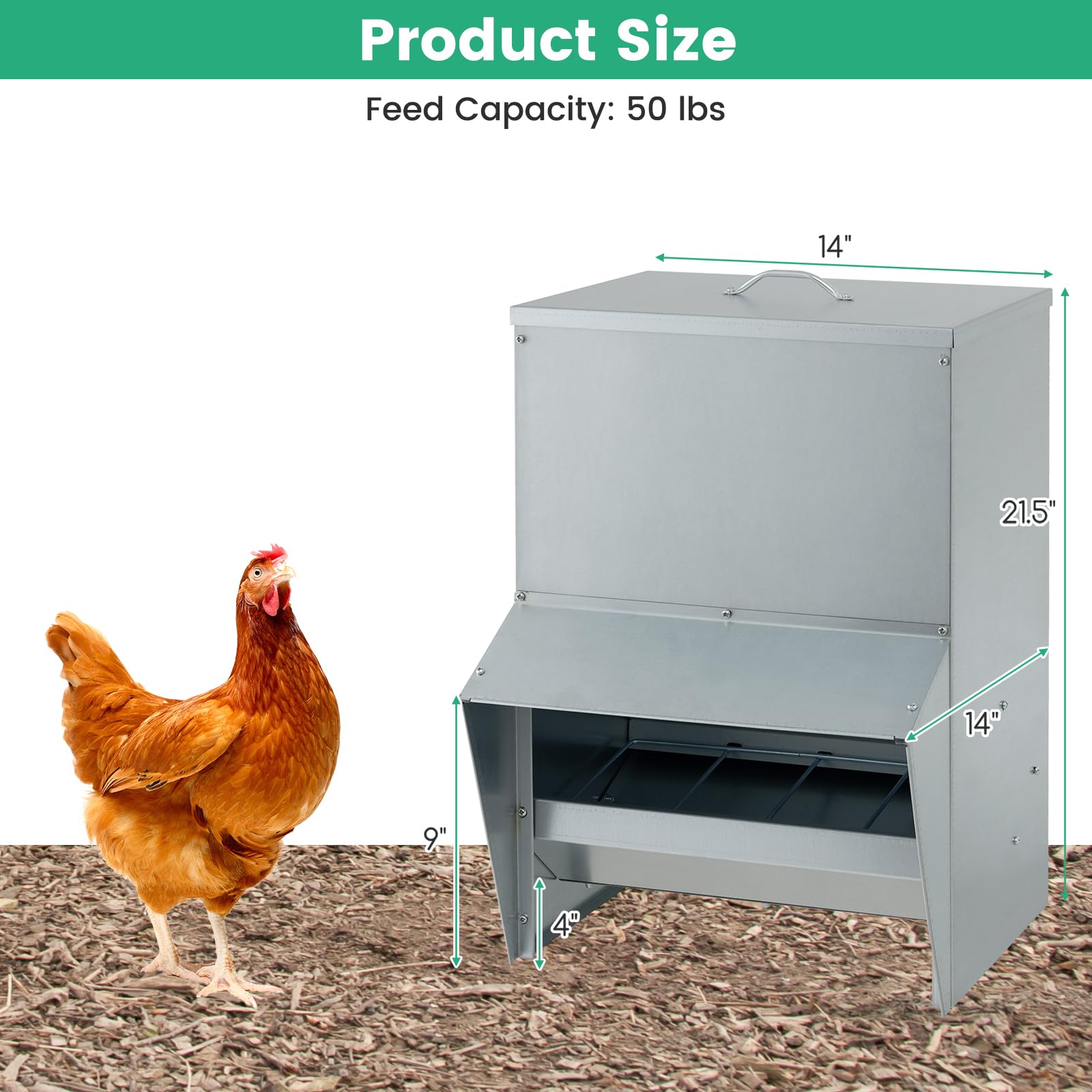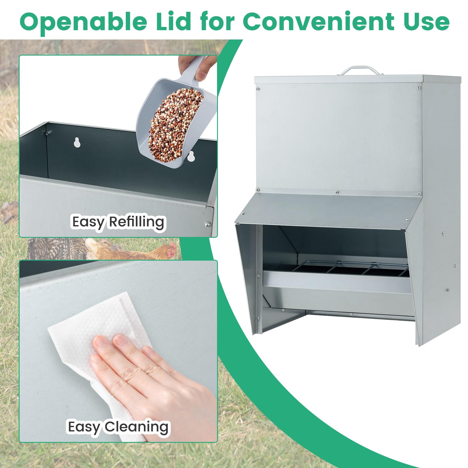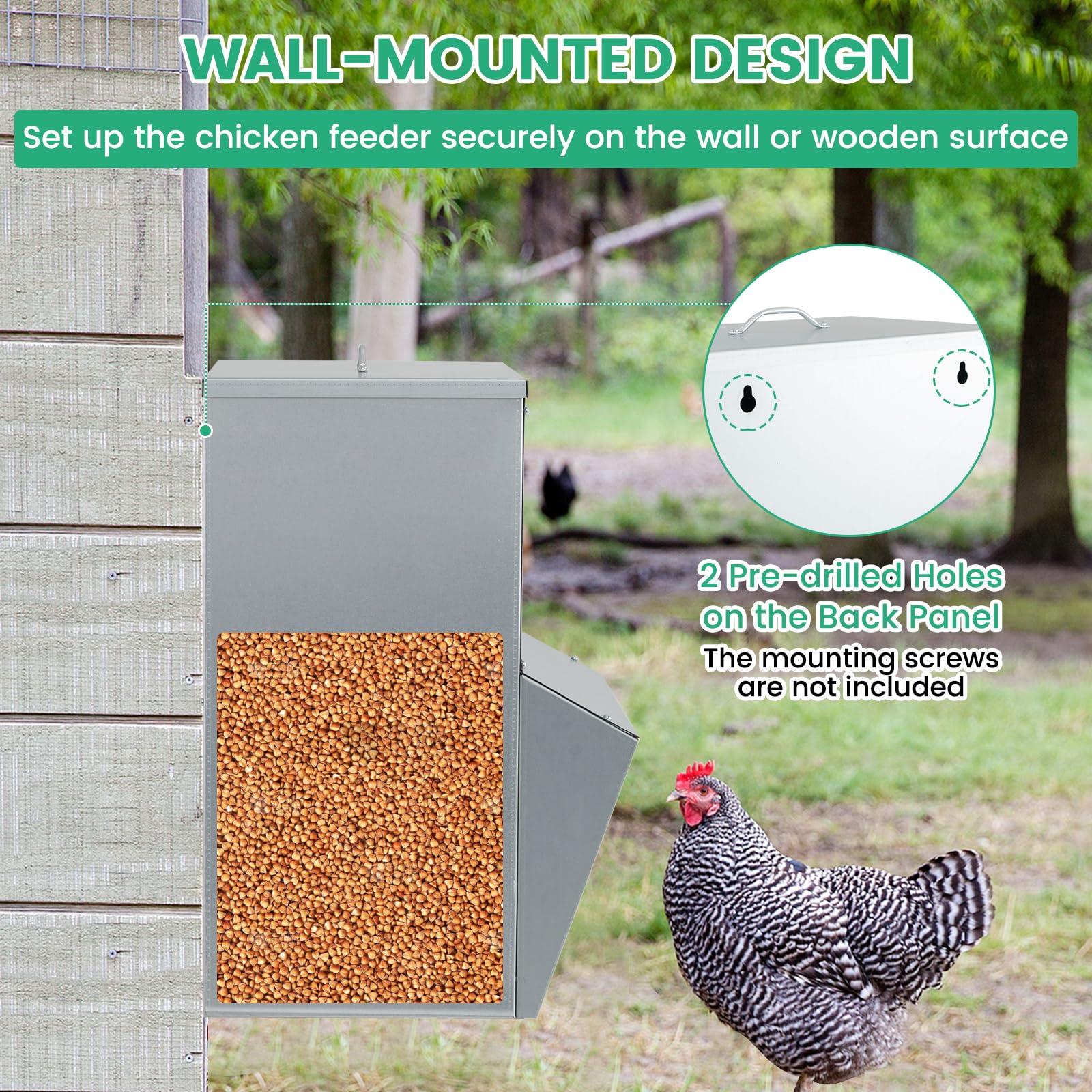 Elevate your poultry care with our galvanized chicken feeder. With 50 lbs large feed capacity, the poultry feeder provides constant food supply for chickens. The openable lid allows for easy refilling and cleaning while the canopy shielding keeps the feed protected from the weather. Moreover, the no-waste coop food dispenser features a semi-enclosed trough that keeps the feed contained and prevents spillage. Constructed from robust galvanized steel, this feeder is not easy to crack or deform, offering durability and reliability. Plus, this wall-mounted feeder not only saves valuable coop floor space but also keeps feed off the ground. The automatic poultry feeder is designed to minimize waste while maximizing convenience, making it a superb choice for outdoor coops and various poultry, including chickens, ducks, bantams, pheasants, and turkeys.