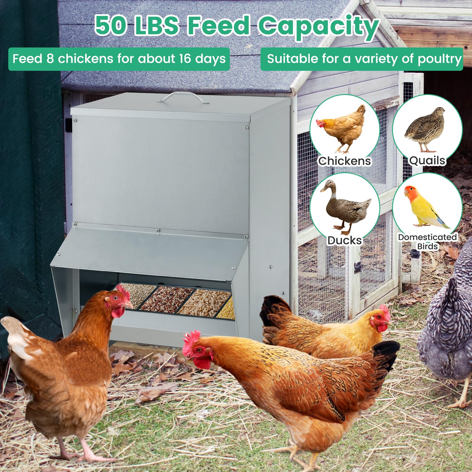 With 50 lbs feed capacity, it can feed 8 chickens for about 16 days