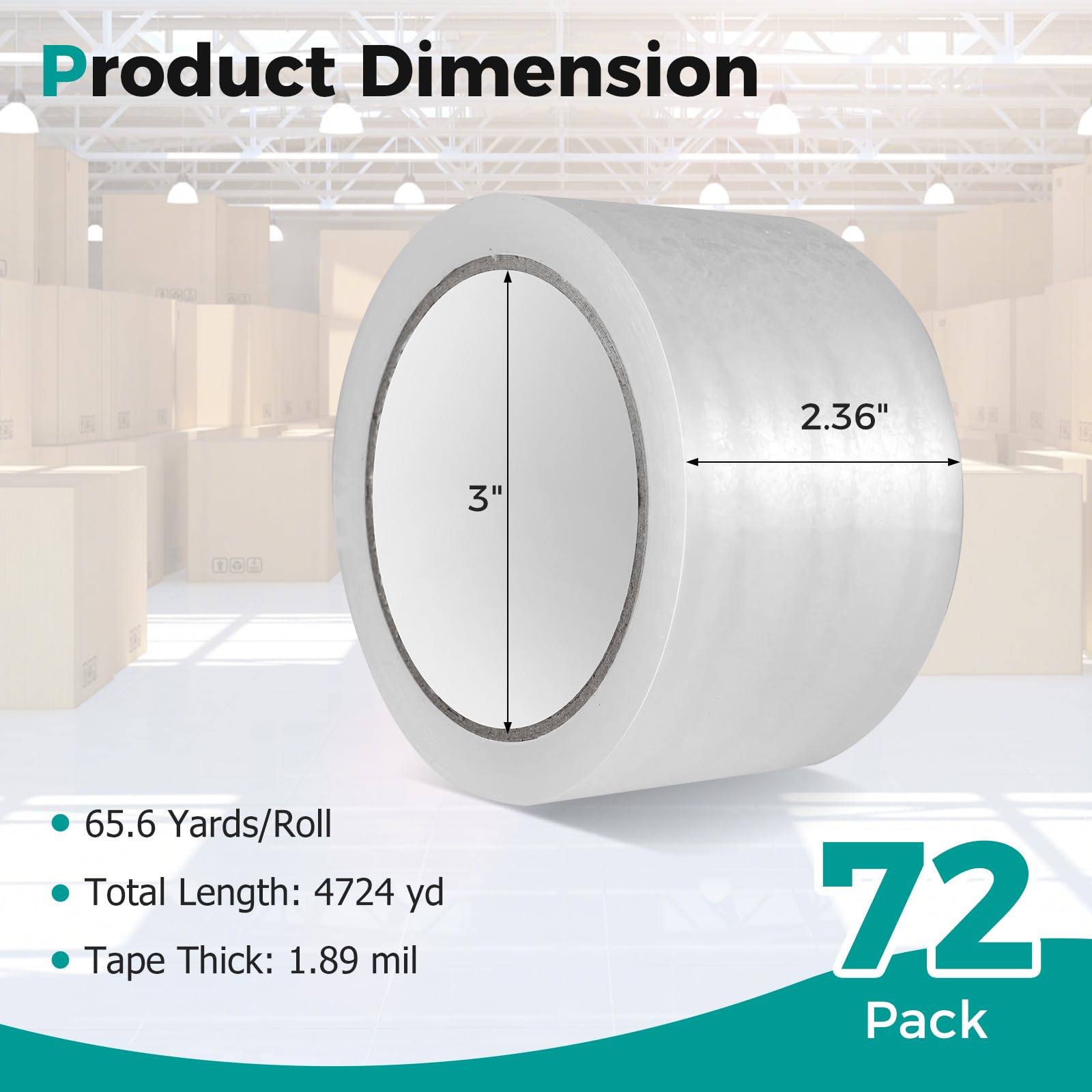 - 72 Rolls of Durable Packaging Tape: Ideal for quick packaging and secure sealing, each roll of packing tape measures 65.6 yards in length and 2.36"/1.89" in width, providing a total length of 4724 yd. Moreover, this tear and fold resistant box tape offers safe and reliable toughness, capable of withstanding 55 lbs of weight without breaking.