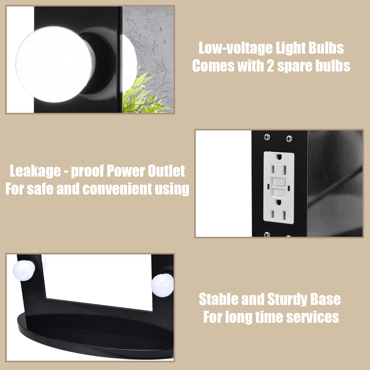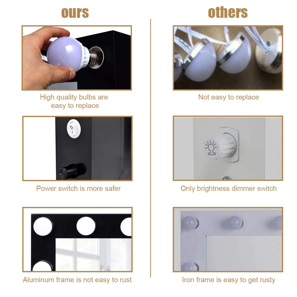 • Durable Aluminum Frame and Wood Base: Made of high-quality aluminum frame and MDF base, the vanity mirror is smoother and more aesthetically pleasing than other products. And, compared with iron base, the MDF base provides lasting durability without deformation, scratch and rust worries.