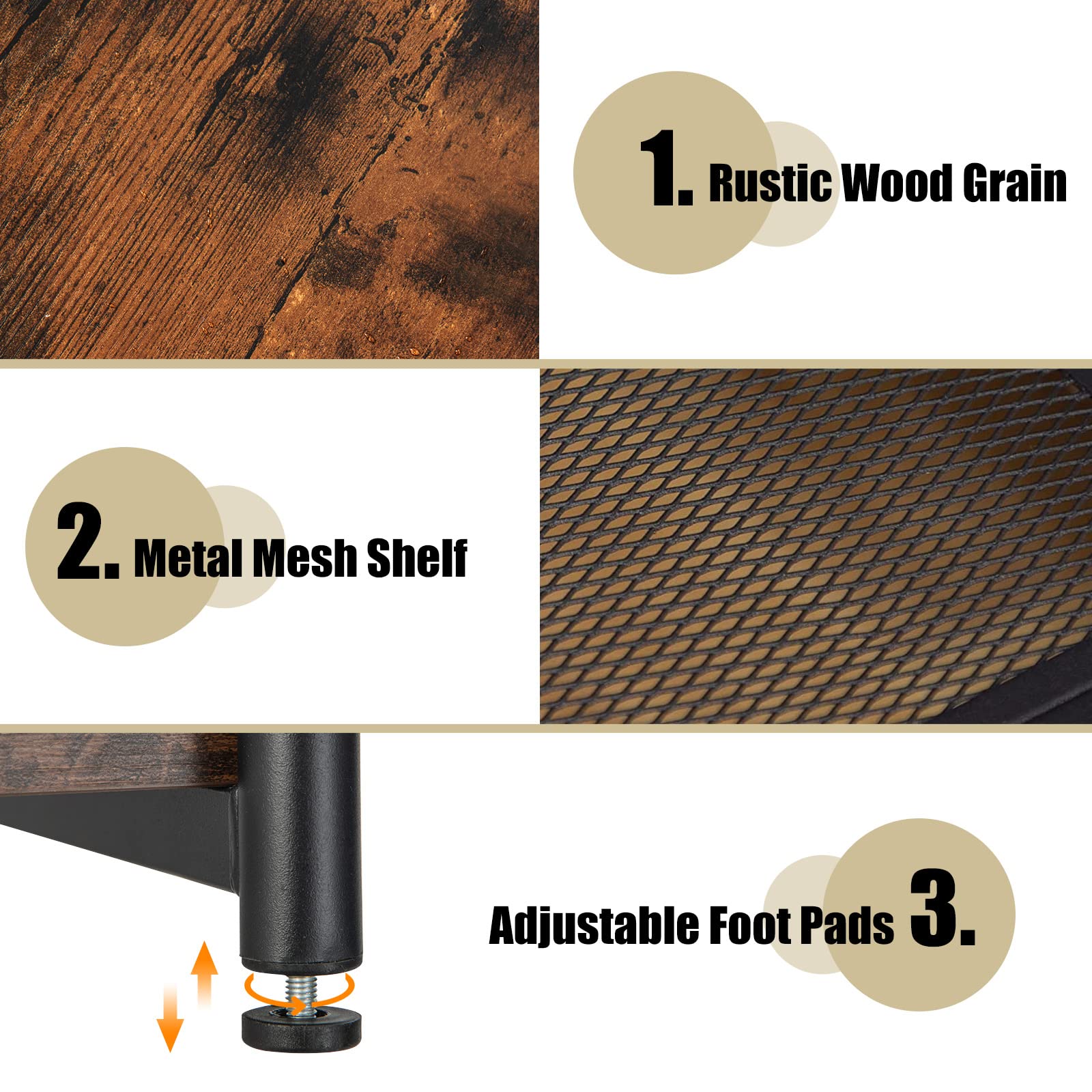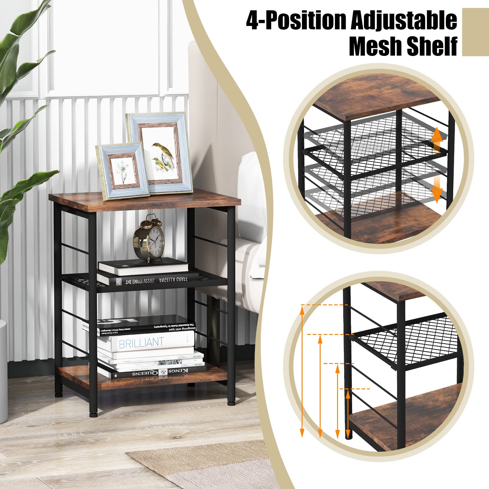 Tangkula Industrial End Table 3-Tier Side Table with Height Adjustable Metal Mesh Shelf