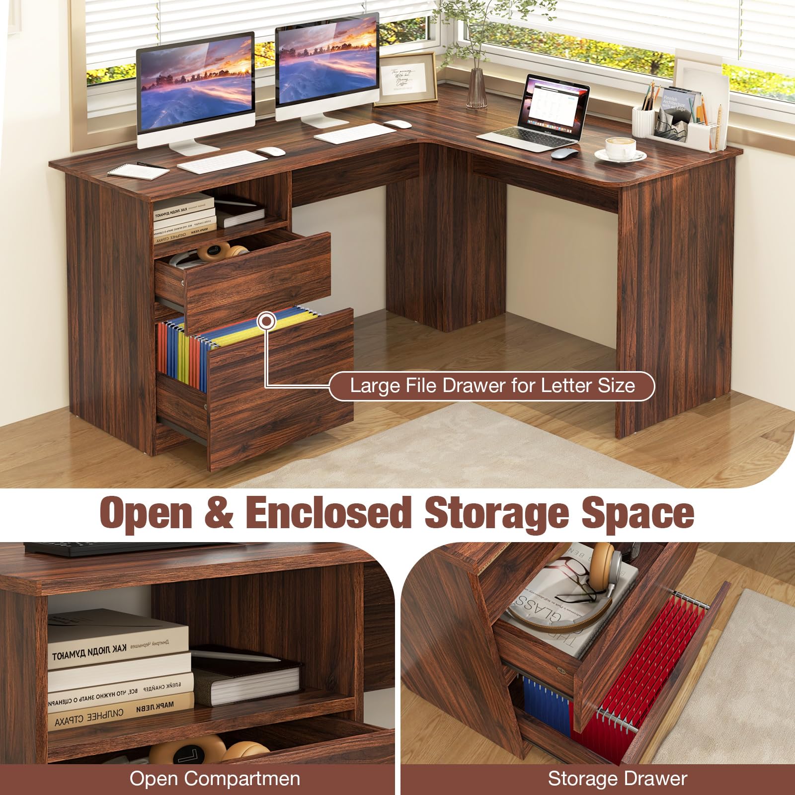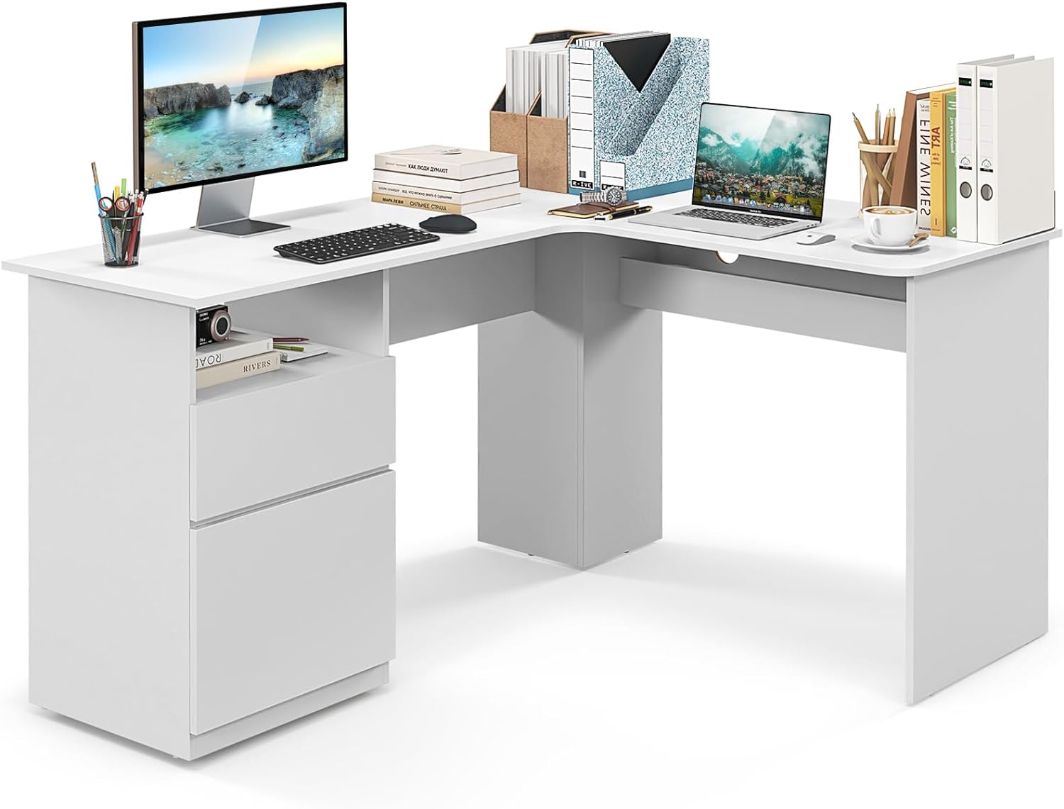 Featuring a large and expansive workstation, the desk surface provides ample room to accommodate multiple monitors and essentials. With a convenient file drawer, you can keep important documents well-organized. For additional storage, the desk includes an open shelf and storage drawer for sundries. The corner computer desk with sturdy construction ensures reliable support and stability. Boasting 2 cable management holes, this large workstation frees from tangled wires. Another key feature is the ample leg room, ensuring comfort during long working sessions. The corner computer desk with sturdy construction ensures reliable support and maintains excellent stability.
