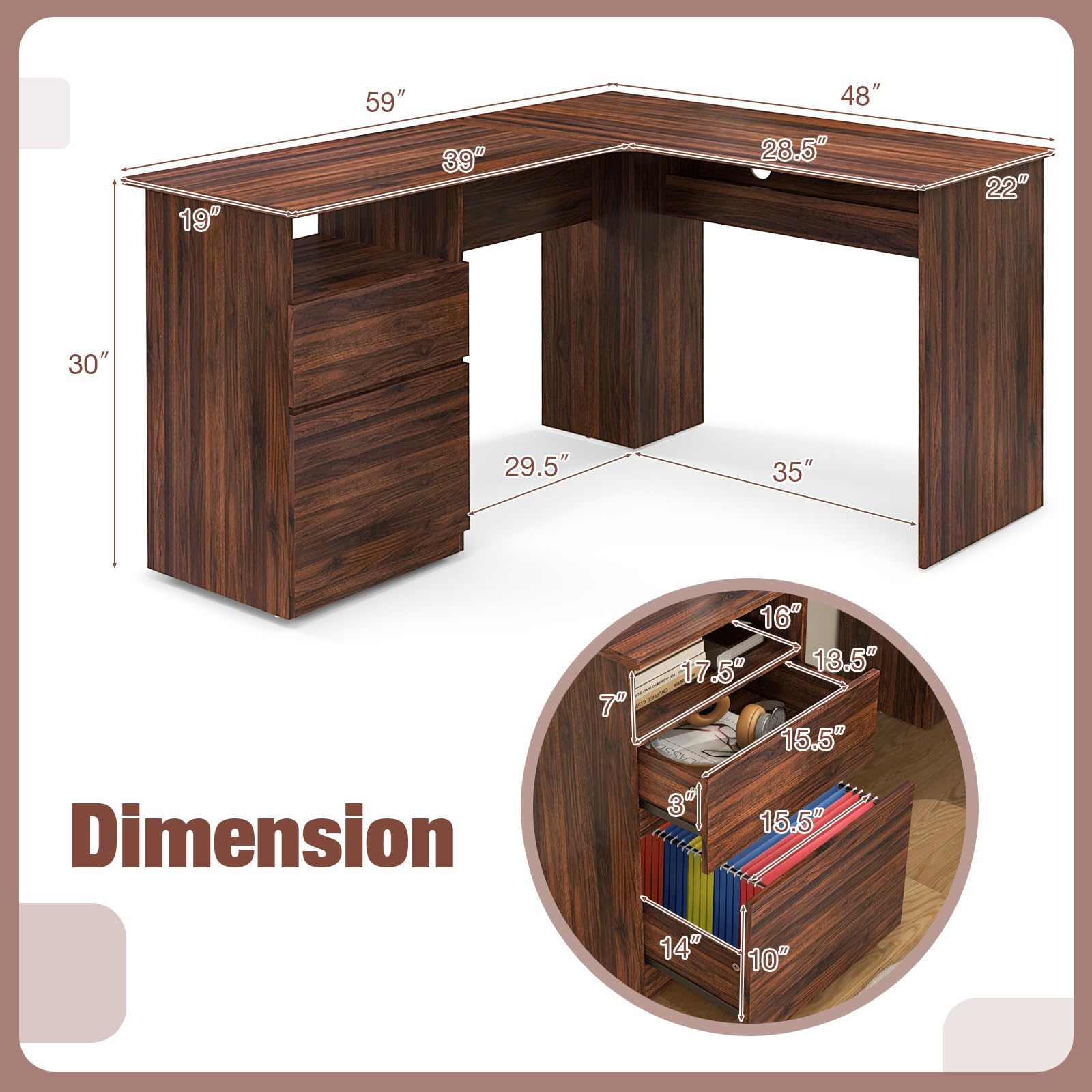 - Utilize Corner Space: The computer desk features a generous 59 inches tabletop to provide ample room for your work essentials. The L-shaped design can fit into corners or open office environment and is perfect for maximizing room space.