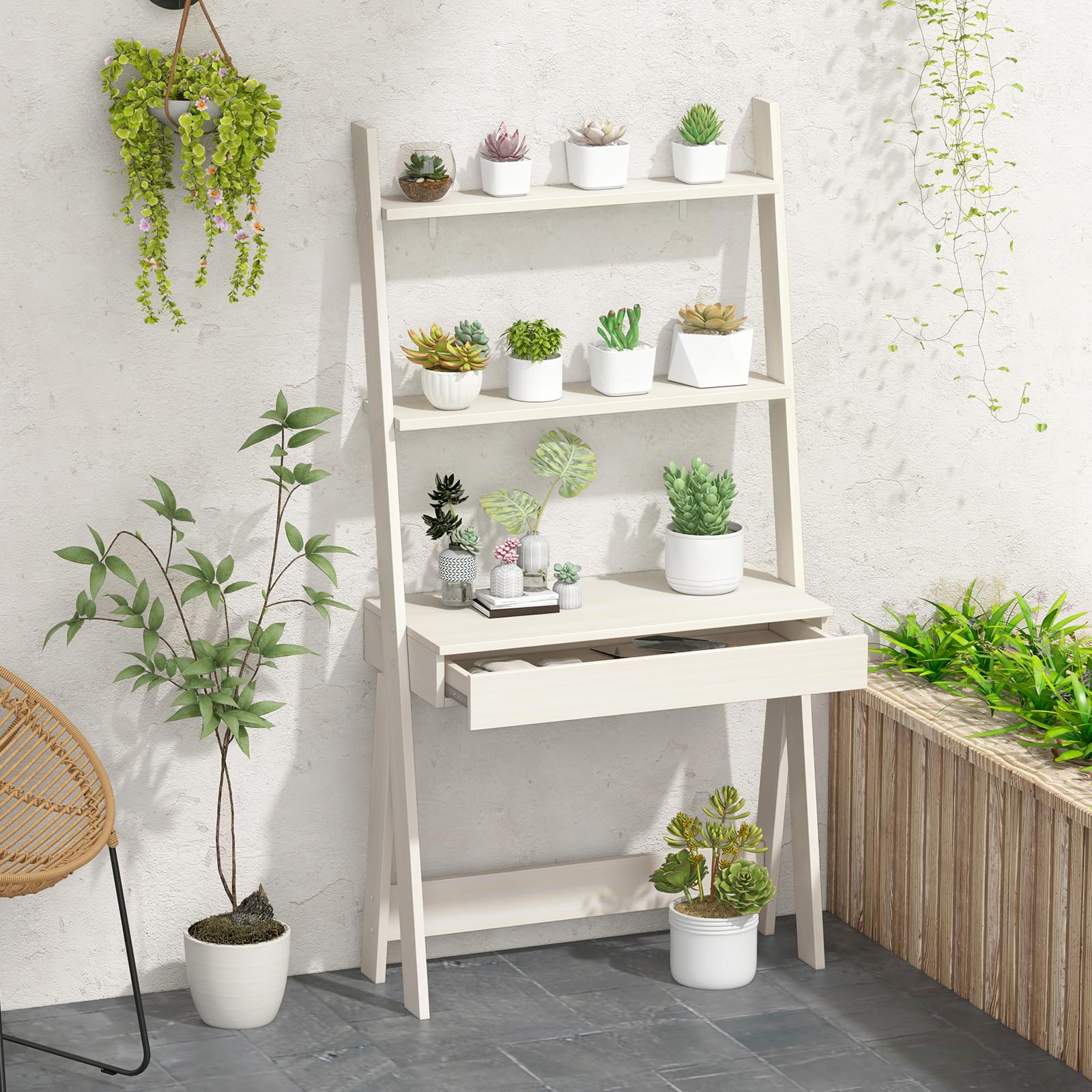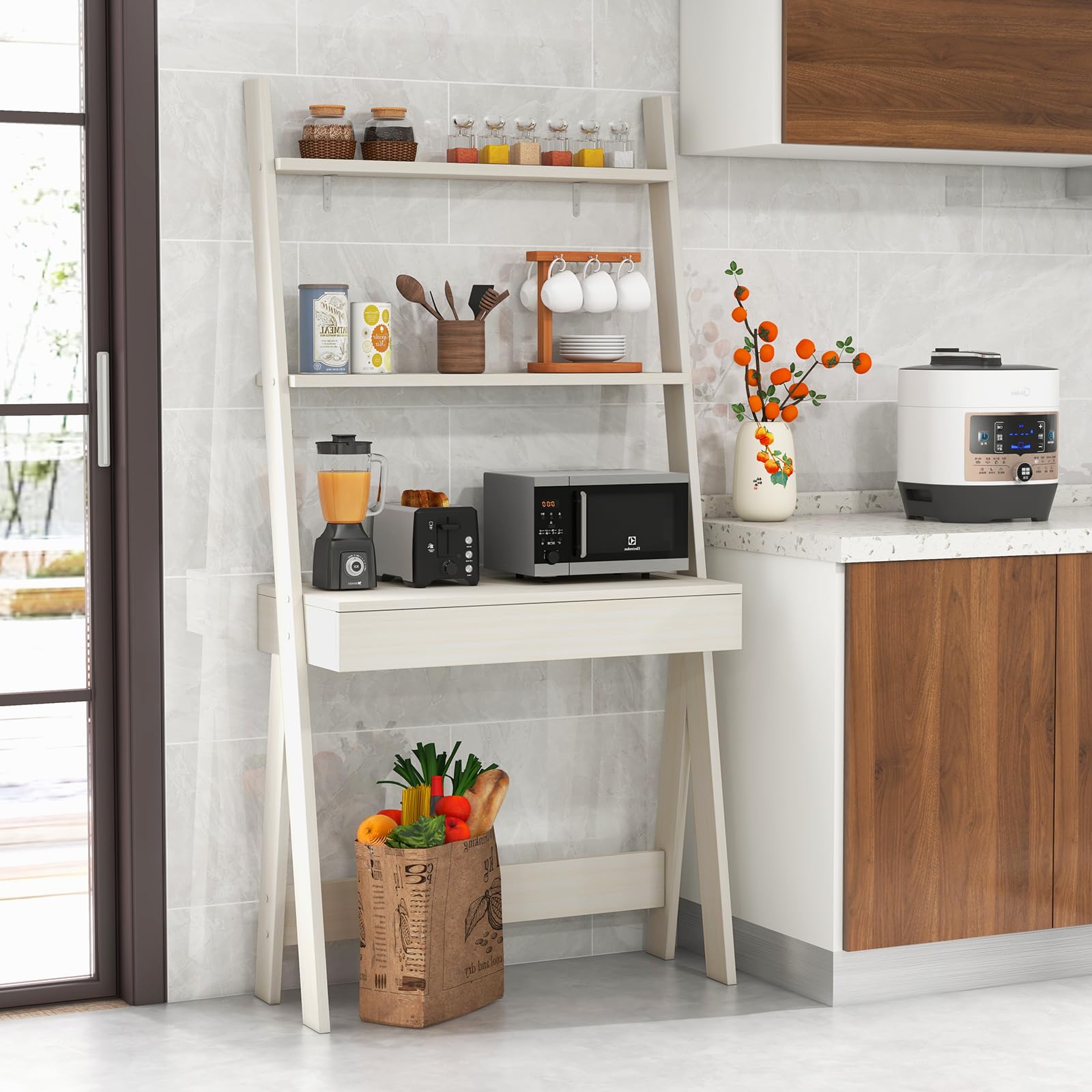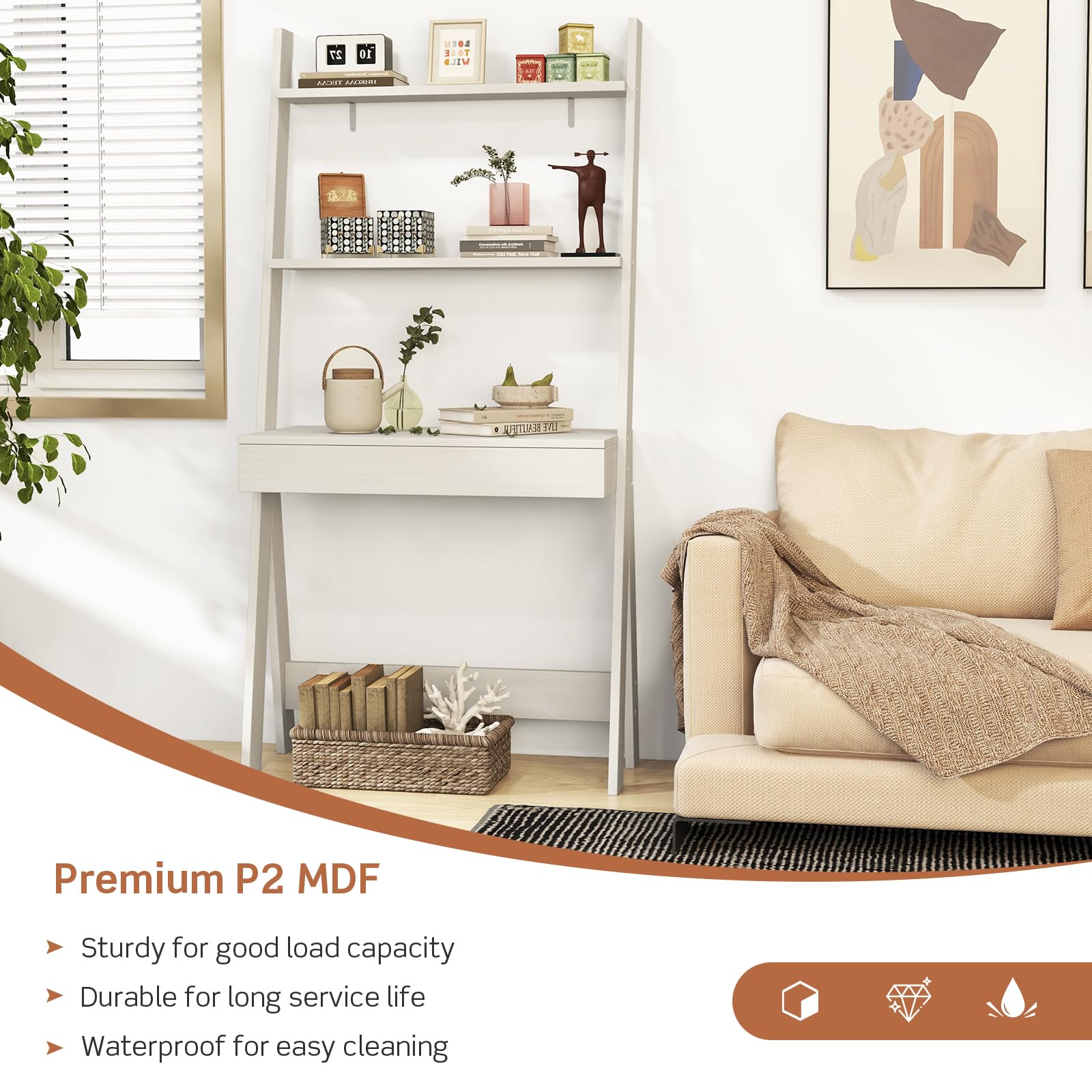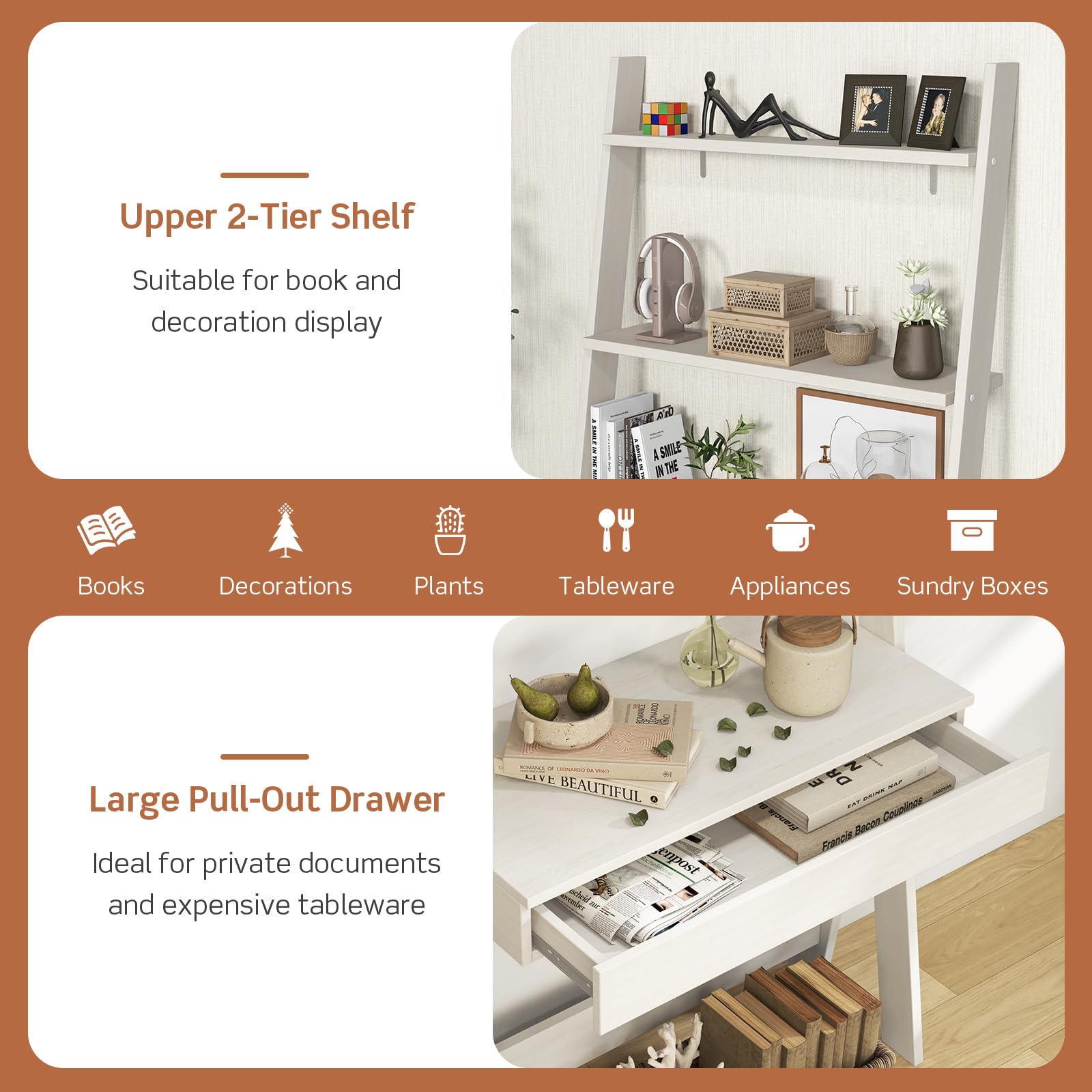 - Roomy Storage Areas: As a clever combination of bookshelf and desk, this ladder shelf provides you with adequate separate storage spaces. The 2-tier bookcase is perfect to display collections and a wide countertop is ideal to accommodate a laptop. Plus, with a large pull-out drawer, your valuable tableware will be well stored.