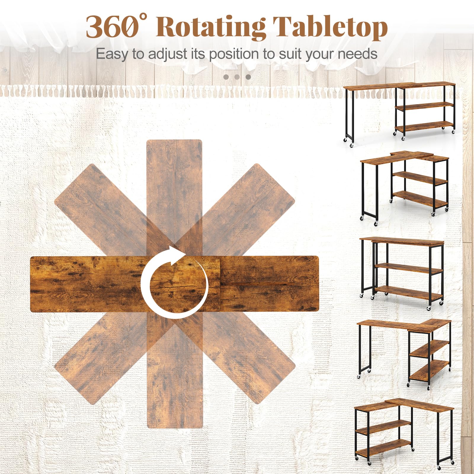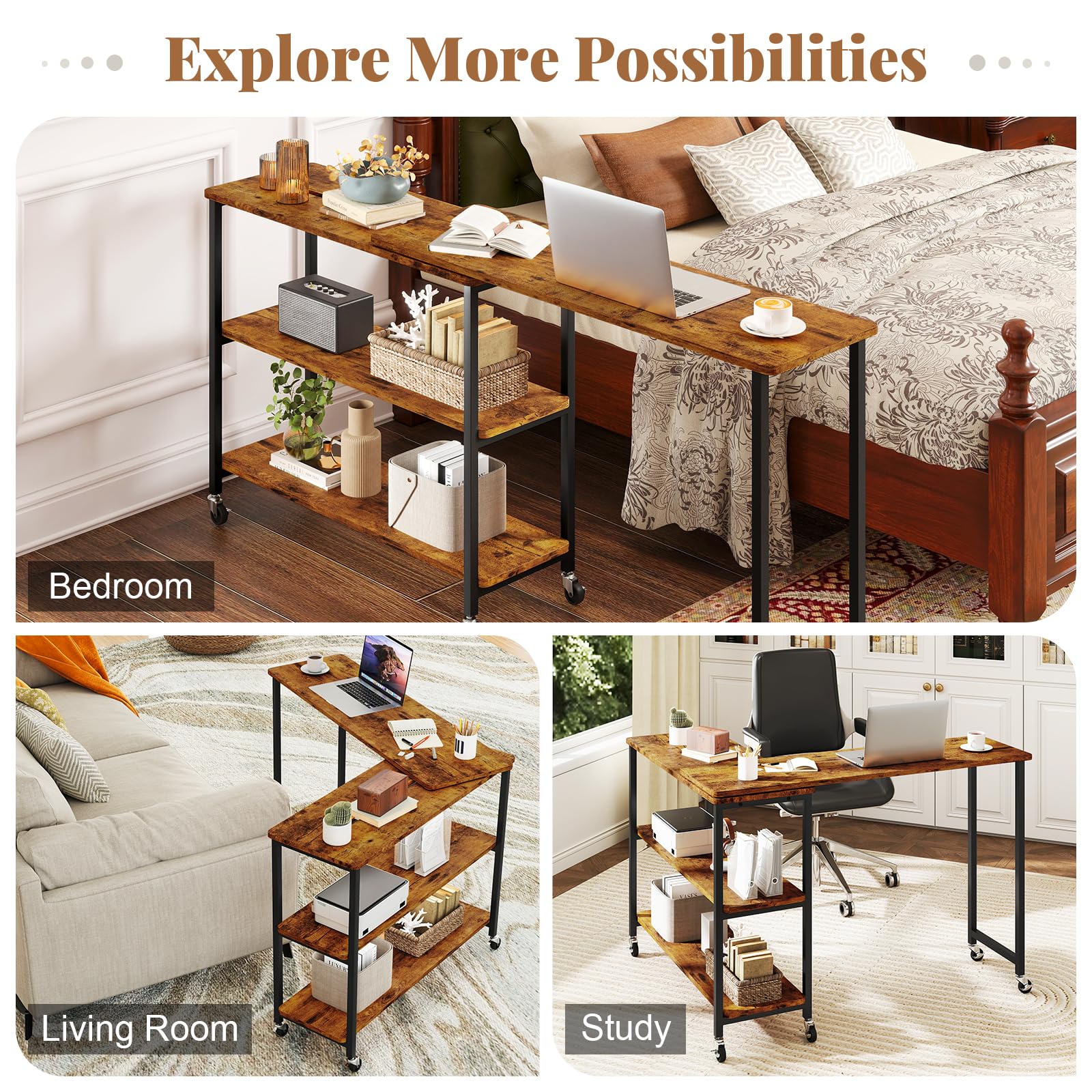 The 360°free rotating tabletop allows you to easily adjust the position of the table, promoting effortless access from any angle. Besides, 2-tier storage shelves offer additional space to organize your essentials. Built to last, this rotating side table features a sturdy metal frame that promises durability and stability. Adding to its practical design, the couch table is equipped with flexible casters for easy movement and sturdily stop. Our industrial sofa side table doubles as an efficient workstation, making it an ideal companion for leisure and work-related activities.