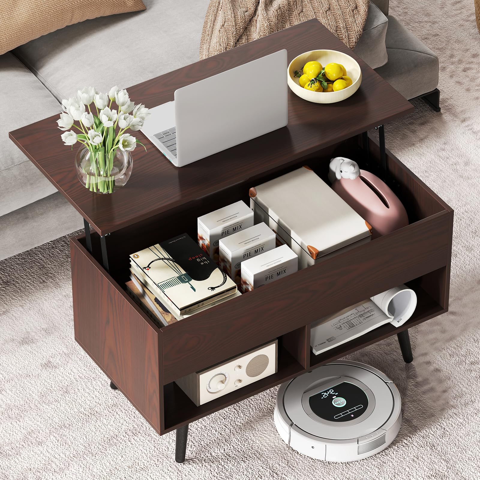 Just enhance the aesthetics of your home with this modern coffee table. Whether you need a spot to study, or just enjoy dining time, it will fulfill your requirement. Metal spring lift mechanism makes it easier to lift and lower the tabletop, providing a comfortable work table or cocktail table for you. Featuring large hidden compartment and 2 open shelves, the coffee table provides ample storage space for your daily supplies, so as to free up more tabletop space. Its sturdy structure leaves you no worry about load bearing capacity and using reliability. Bring this coffee table home which strikes perfect balance between functionality and stylish design.