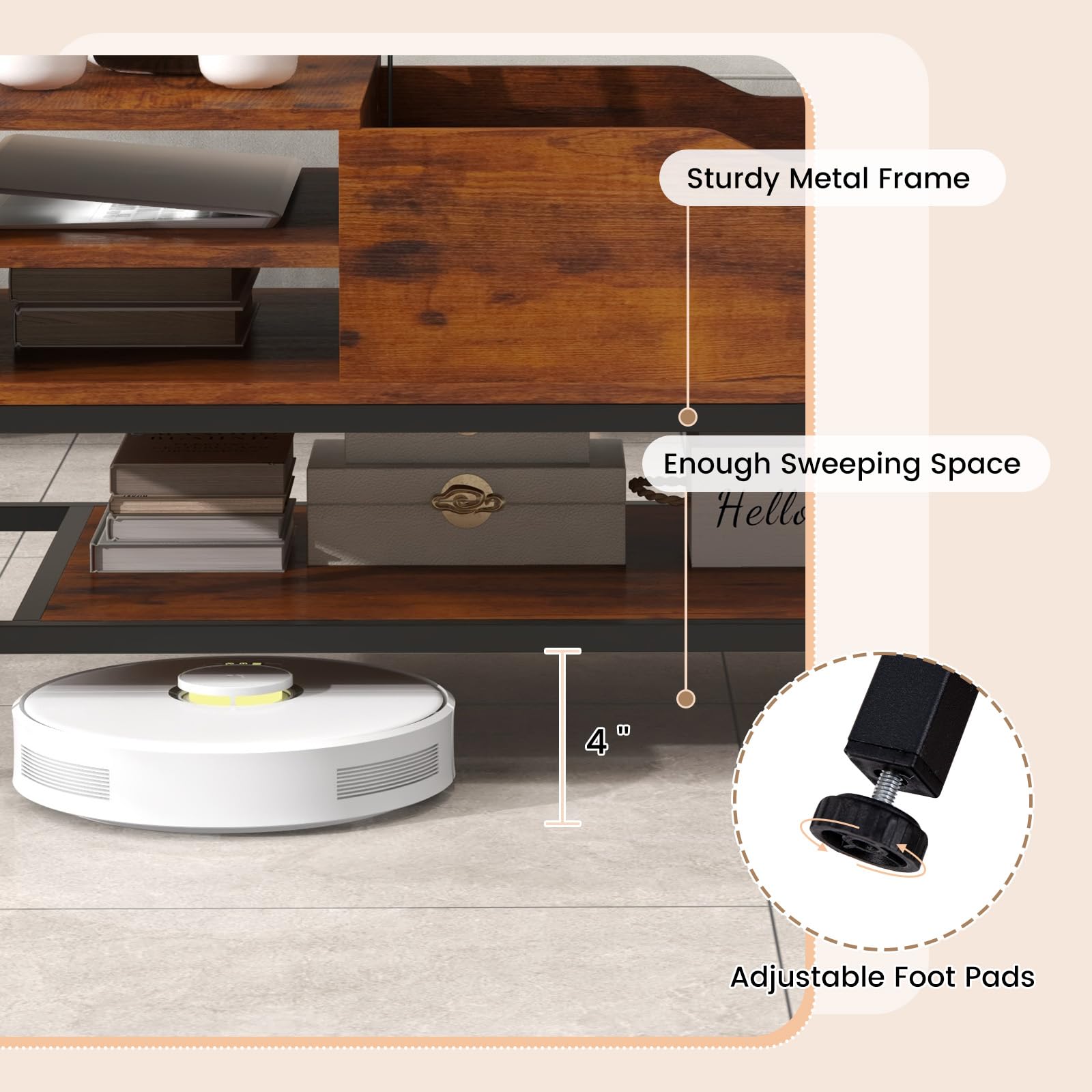 - Sturdy Metal Frame: Built with a sturdy metal frame, this center table boasts stability and durability. Its solid construction supports items without wobbling, thanks to the adjustable foot pads that adapt to uneven floor surfaces.