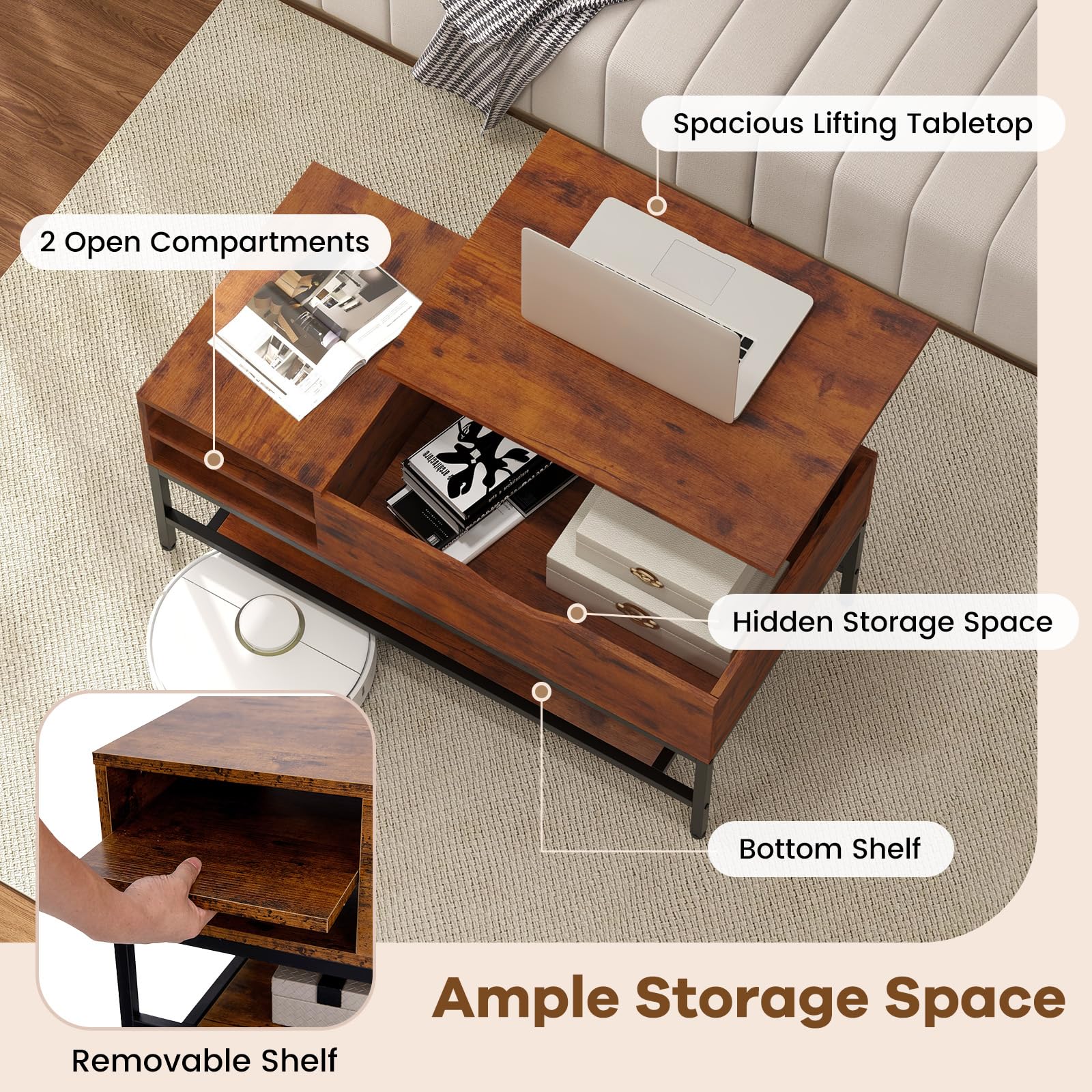 - Removable Shelf: The lift-top coffee table comes with a removable shelf, offering flexible storage solutions based on your needs. From magazines, CDs to game controllers, you can organize various essentials in a convenient way.