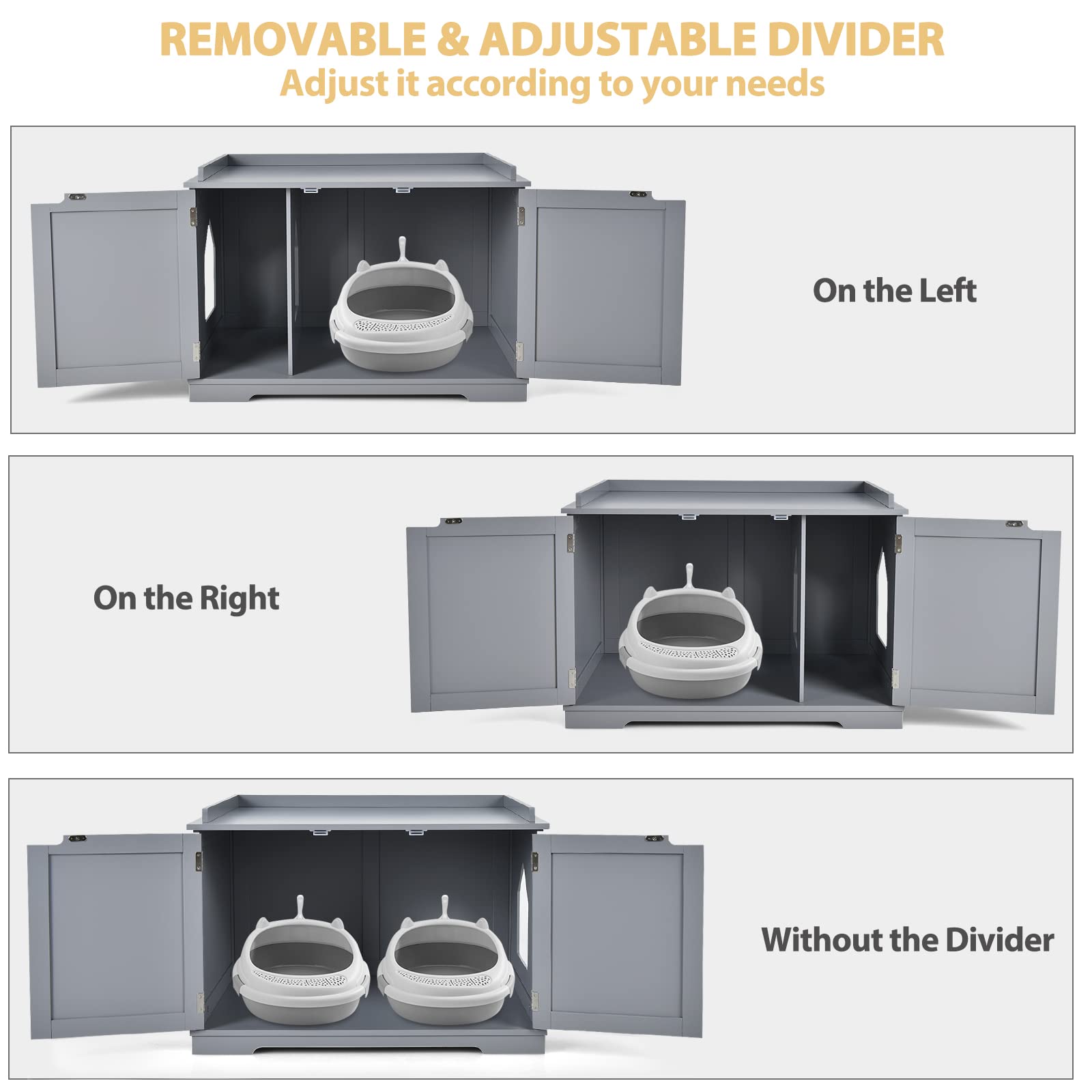 - Even for Large Cat Litter Boxes: Featuring with a large-sized cat hole in the dimension of 7.9” x 9.3”, it makes your big strong cat to enter and exit at will. Small divider internal dimensions :7.9"L x 20.5"W, large divider internal dimensions :19.5"L x 20.5" W. Oversized interior space to fit most sizes of litter boxes. The detachable design of our partition panel can meet your needs of placing a larger litter box or two small kitty litter boxes.