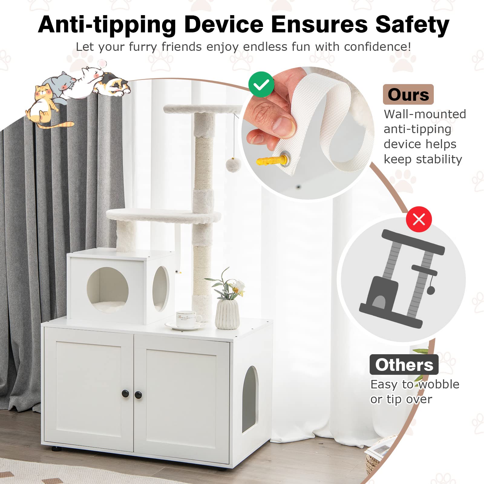 - Safe & Thoughtful Details: The modern cat tree is equipped with a wall-mounted anti-tipping device to keep stability, which is safe for your kids and pets. Additionally, adjustable foot pads will avoid wobbling on uneven floors. And the cat cabinet is designed with air vents to reduce unpleasant smells.