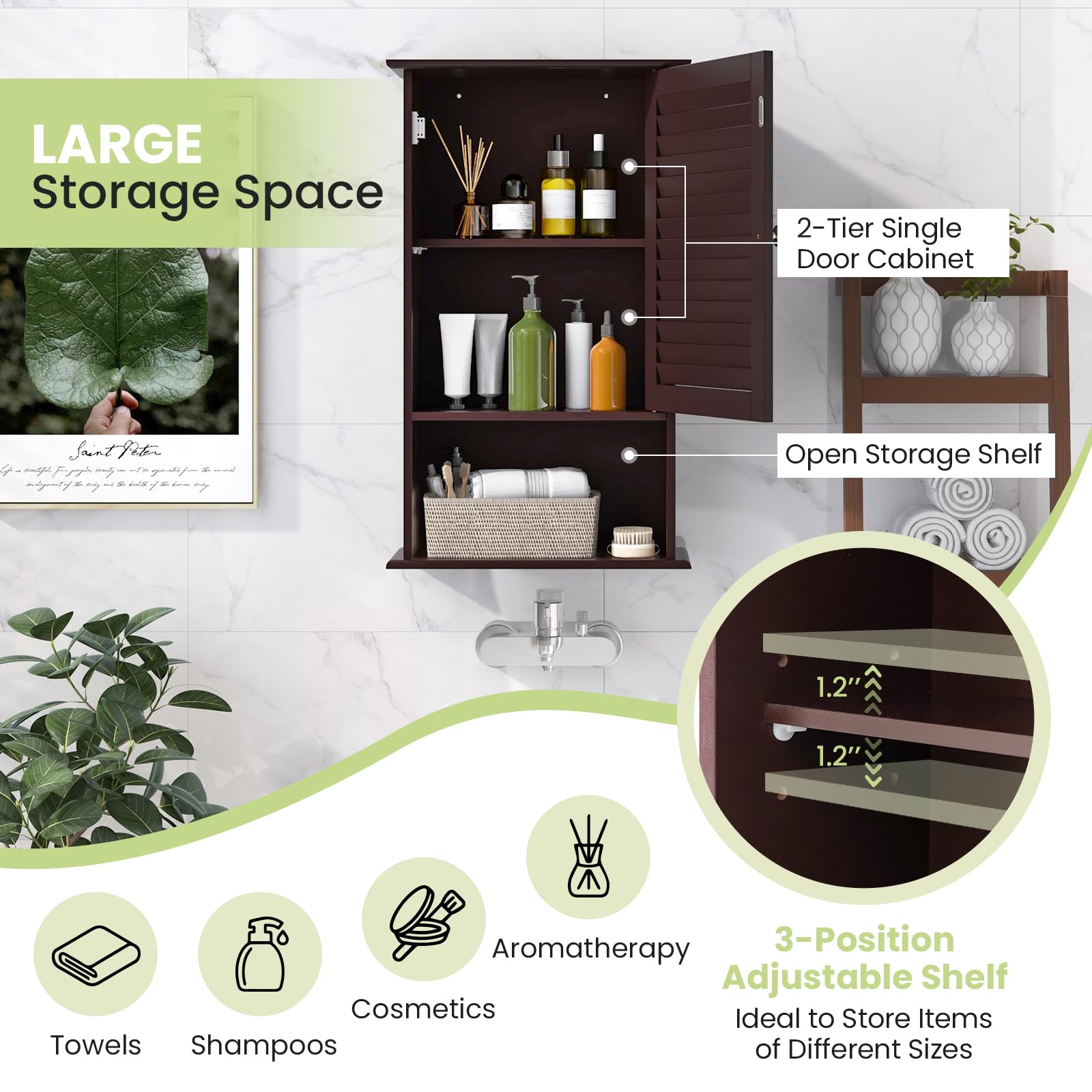 - Simple and Stylish Design: The bathroom wall cabinet has a simple and stylish design, and the woody material is full of texture. It features an enclosed shelf with a unique louver door design, and one open shelf to place towels, soap, tissues, and other decorative items. In addition, you can also put some green small plants on the open shelf to make your room neat and beautiful.