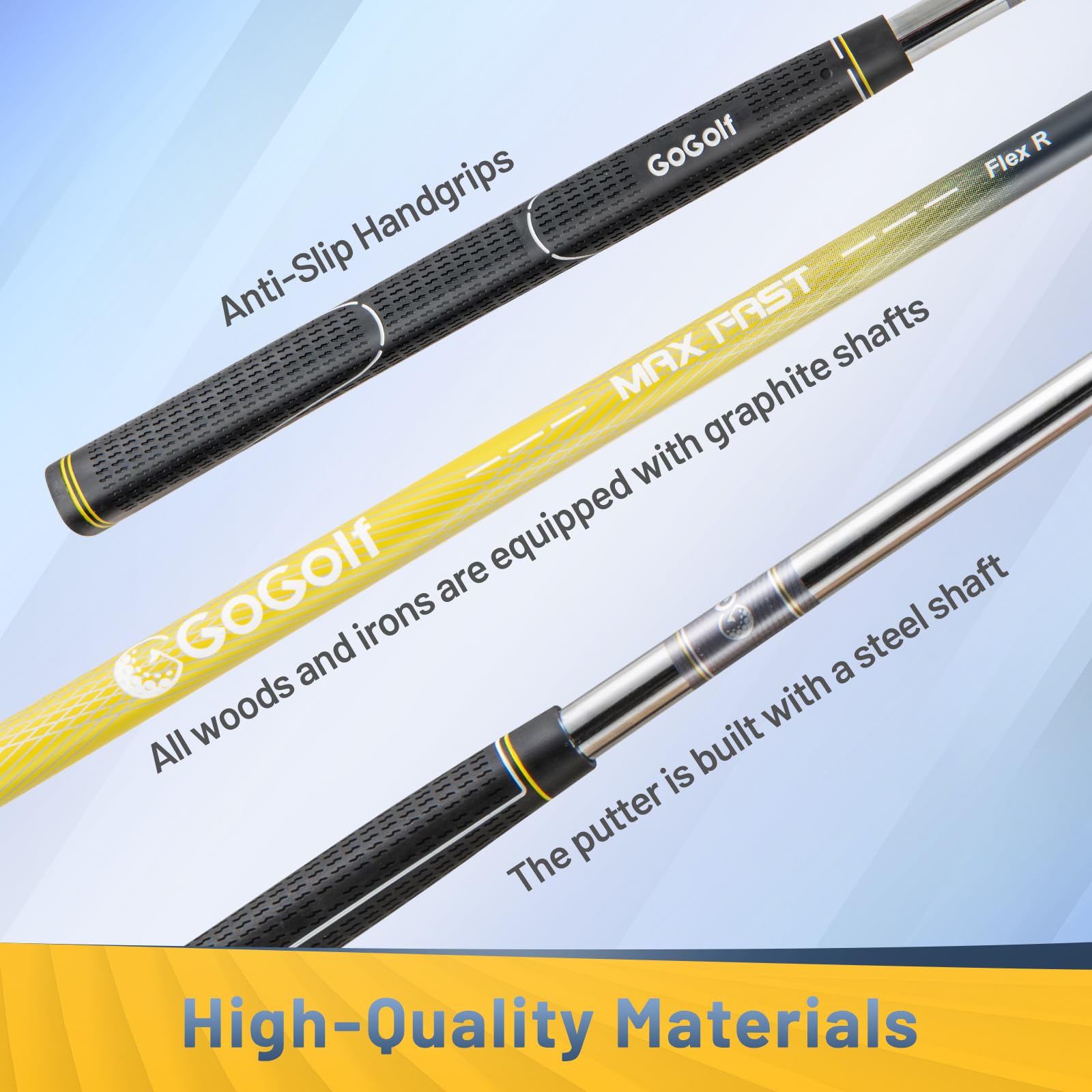 You will experience high-performance woods and irons with graphite shafts for optimal play. The irons' low center of gravity and cavity back design enhance stability and forgiveness, while the putter aids in precise putting. The lightweight and portable golf bag features ample storage, ensuring comfort and organization on the course.