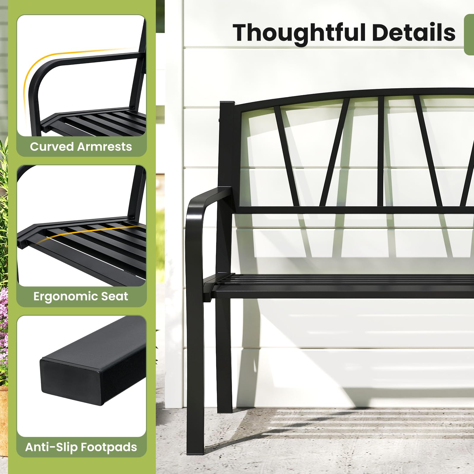 Constructed with robust and anti-deformation metal frame, this bench boasts a well-coated finish for durability and footpads for stability. The wide seat and sturdy support make the bench able to seat up to 2-3 people. The ergonomic seat and curved armrests ensure comfort for prolonged periods, while its minimalistic backrest adds sophistication to garden, patio, or poolside setting. Make this versatile and stylish bench with thoughtful details a centerpiece in your outdoor relaxing space ideal for enjoying beautiful days in elegance.