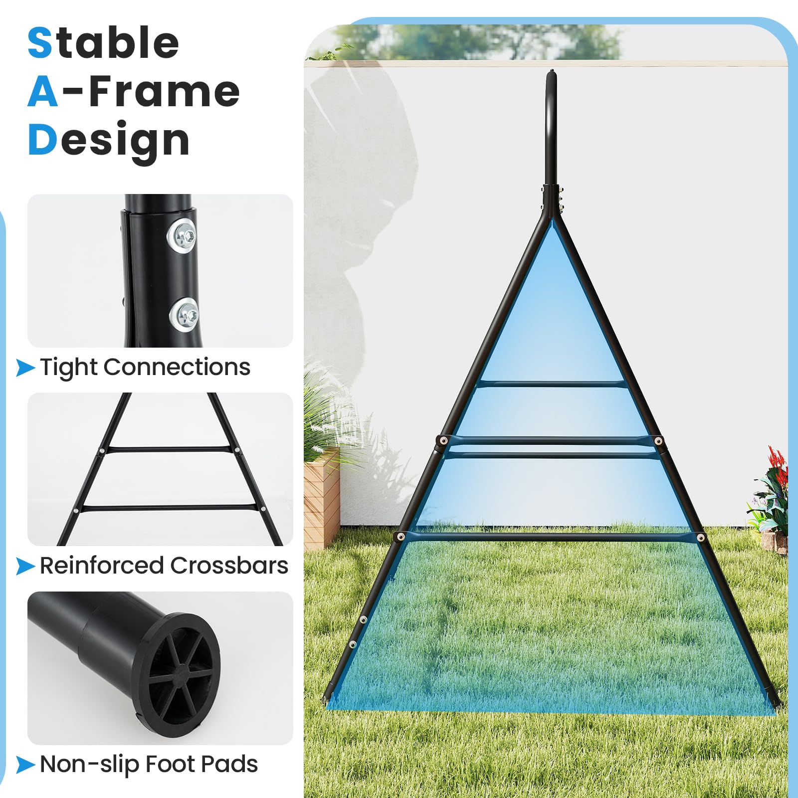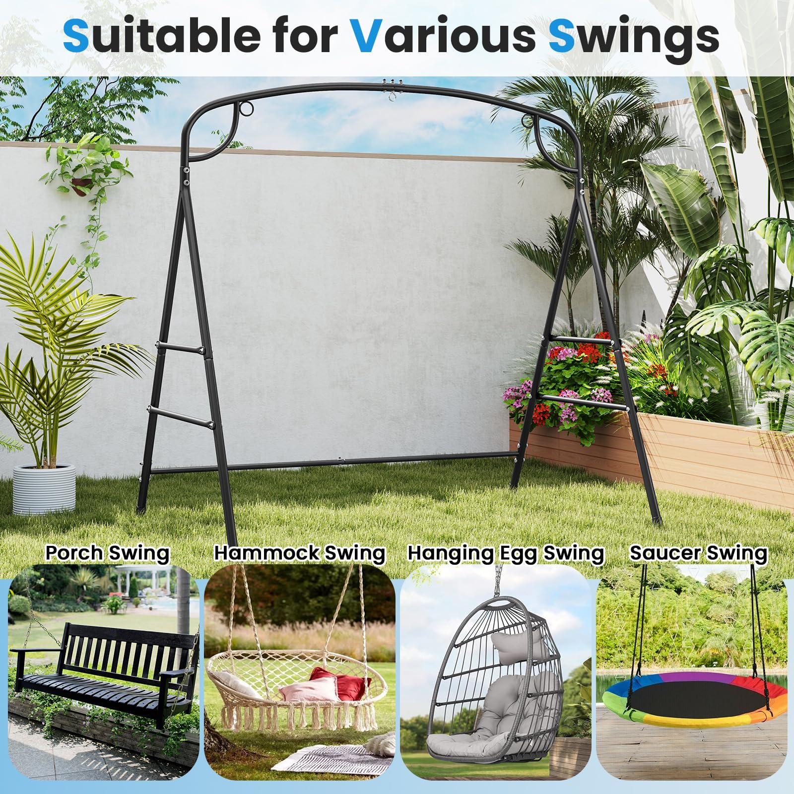 Boasting a sturdy metal construction, this porch swing stand is a reliable addition to your outdoor space. The A-frame structure with multiple crossbars and anti-slip foot pads ensures high stability, allowing the swing frame to support up to 660 lbs. With 2 hanging options and 3 rings, you can install various types of swings, including hammock swings, hanging egg swings, saucer swings, and more. Additionally, this metal swing stand is a perfect complement for backyards, gardens, or porches, providing a comfortable space for reading, napping, or simply relaxing