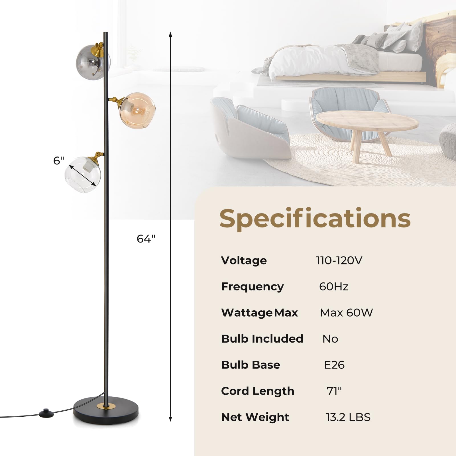 - [160° Angle-Adjustable Globes]: This floor lamp features 3 glass globe lampshades in different colors, which not only offer you eye protection, but also add more beauty and elegance. And the 160° adjustable angle of each globe meets more of your demands.
