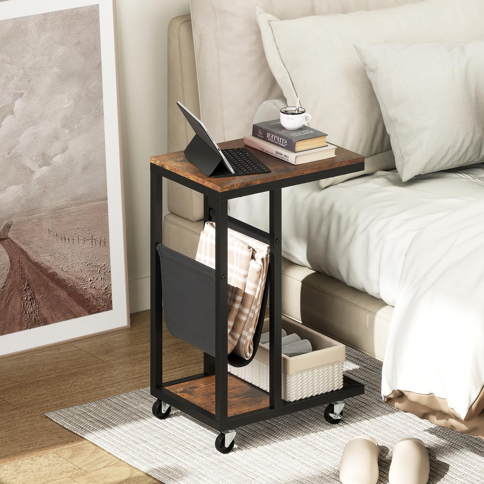 Discover the charms of compact convenience with our sleek, space-saving C-shaped side table! Measuring a perfect 16" x 11" x 23", it slides effortlessly beside your couch or bed. Imagine tucking away all your go-to items neatly on its spacious tabletop, handy canvas pouch, and sturdy bottom shelf. Transform any tight space with style! Mobility is a breeze - glide it anywhere with its smooth rolling casters, and lock it in place when you've found the perfect spot. Built with a robust metal frame, this standout piece ensures premium quality and style that lasts. Add a touch of industrial chic that works smart for your space today!
