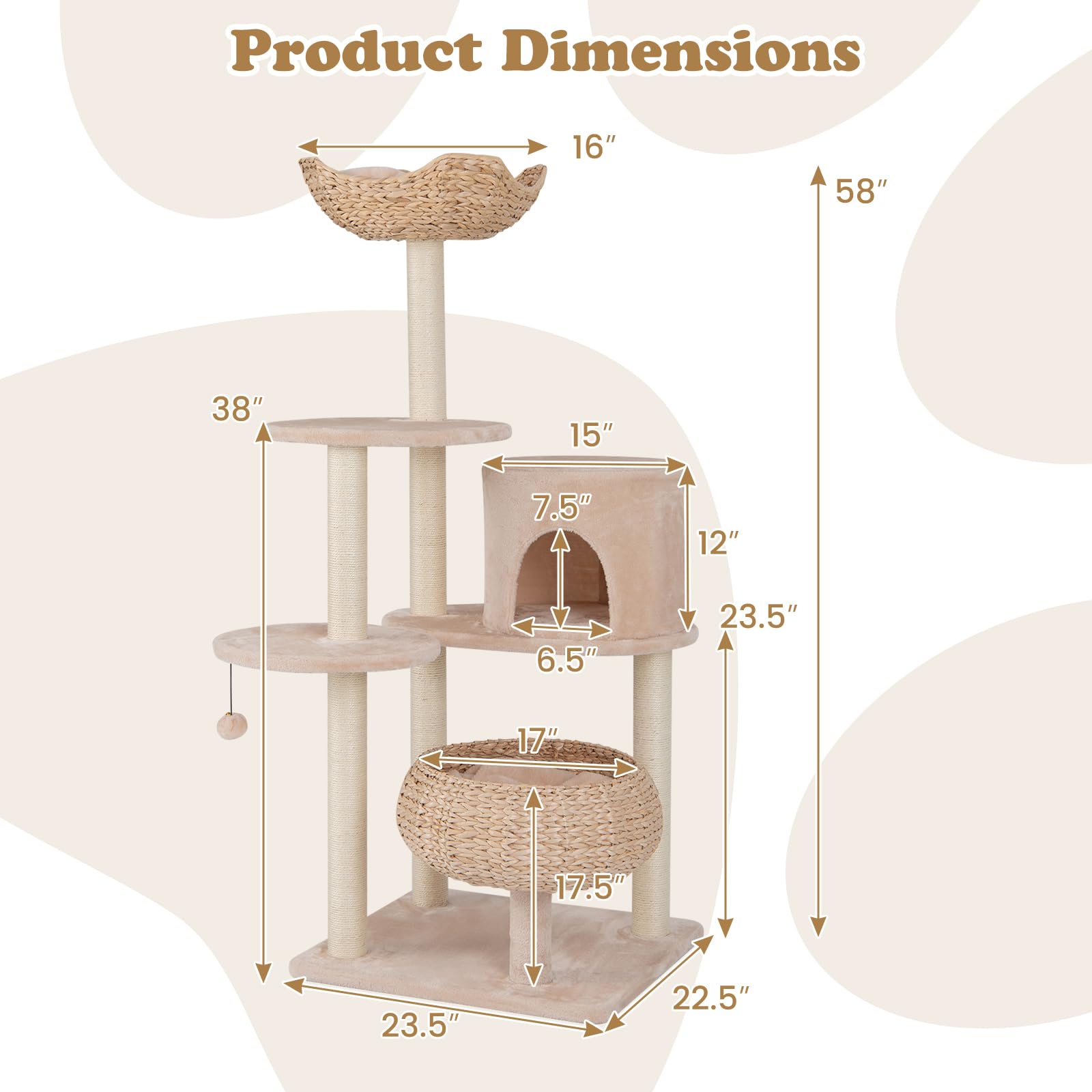 Your cat can enjoy the comfort of a plush basket cat bed for restful naps, or seek solitude in the cozy condo for some quiet time. The top perch offers a high vantage point, perfect for surveying the room. Moreover, the perch and condo are crafted from hand-woven cattail material for durability and comfort. Additionally, the plush dangling ball adds an element of fun. The cat tower features several sisal scratching posts, which are ideal for maintaining healthy claws. Besides, the removable and washable cushions provide ultimate comfort and ease of maintenance. The 5-level cat tower is a perfect addition to any cat owner's home.