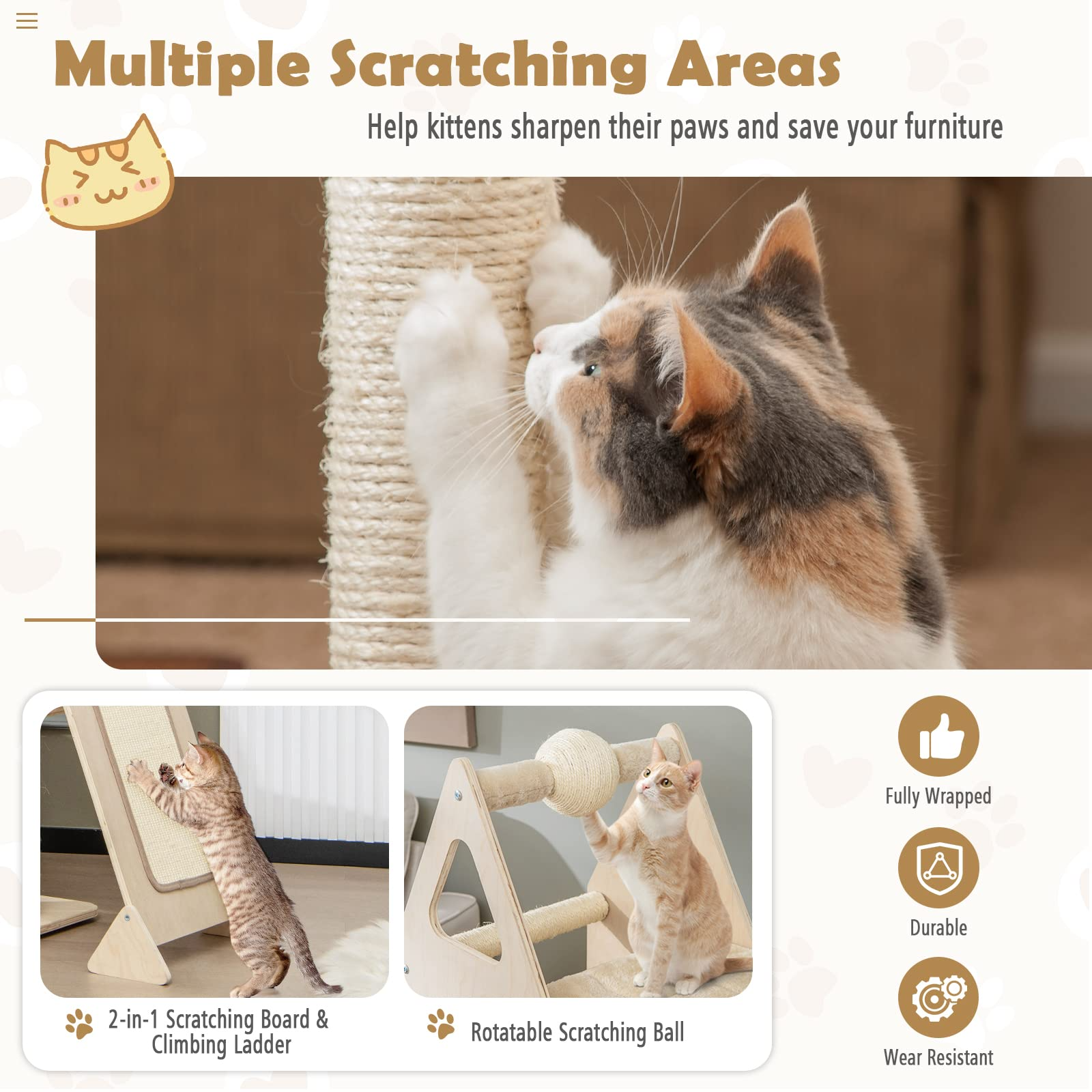 - Multiple Scratching Areas: The cat tower is designed with a rotatable scratching ball and scratching posts that are covered by safe and natural sisal ropes, helping kittens sharpen their paws while saving your furniture. What’s more, there exists a 2-in-1 scratching board and climbing ladder, meeting different needs.